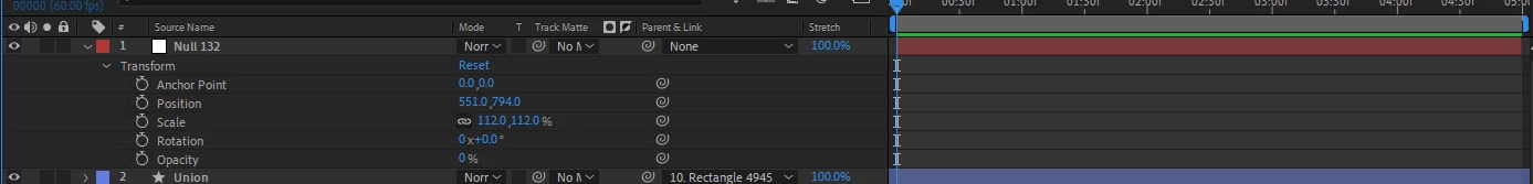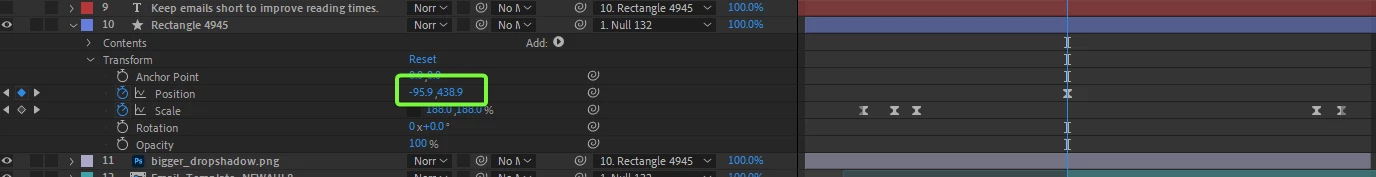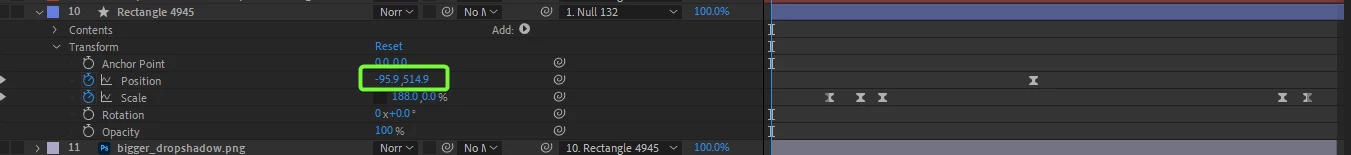 It did not escape me that Rectangle 4945 is linked to a parent layer - "Null 132". But I checked and Null 132 has no animations at all. I seleted Null 132 and hit the key U and nothing showed up. I expanded the Transform properties and I see no keyframes. So the vertical animation is not being brought in from a linked layer