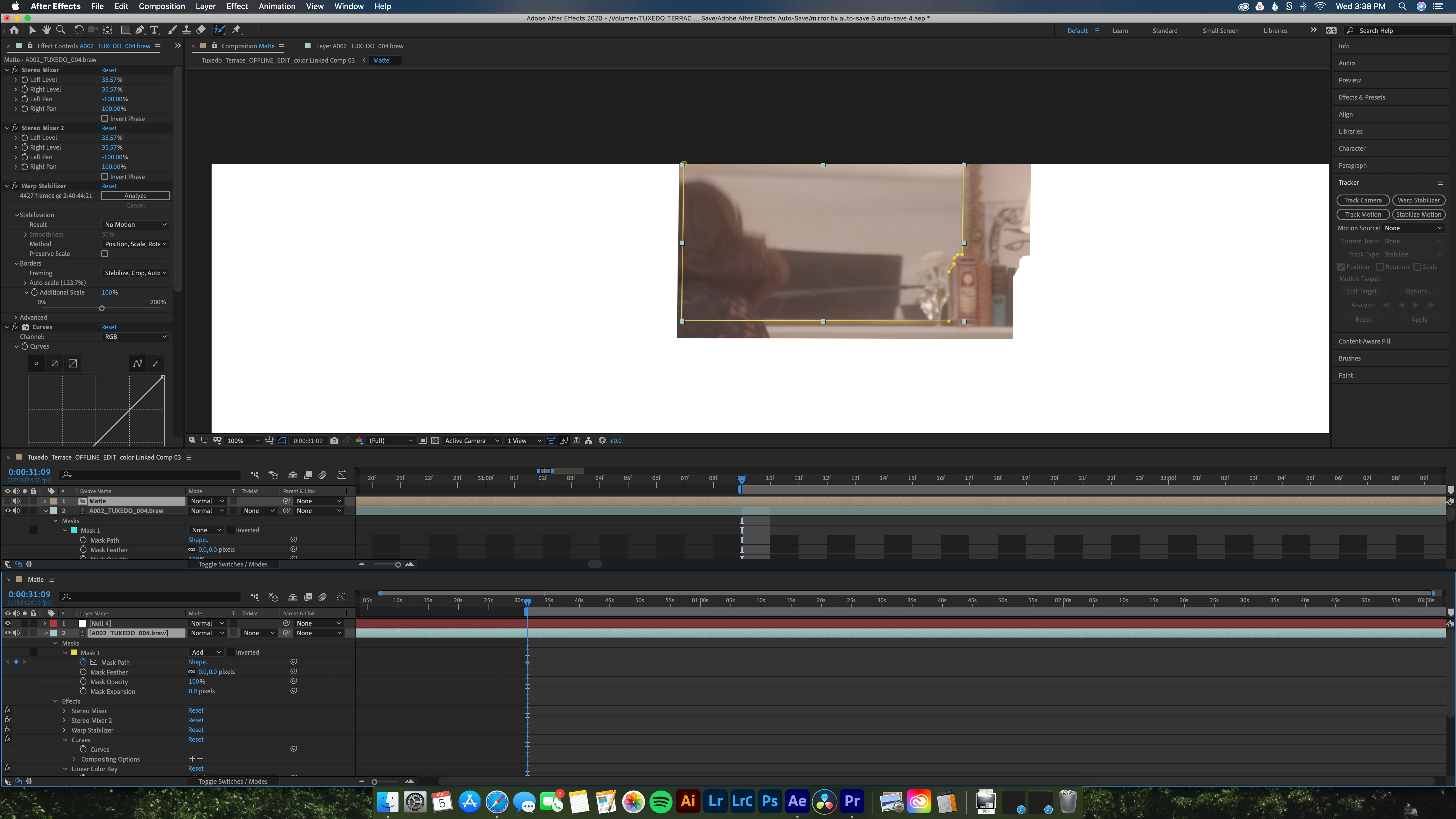 In After Effects, I'm trying to clone away unwanted objects that are being reflected in a rectangular mirror. So the objects are not free floating where Content Aware Fill can easily track it, they touch the bottom edge of the mirror the entire length. So I have been using a reference frame from Photoshop that I made while attempting to make Content Aware Fill work, I'm using it as a time remapped layer under the source footage layer. The source footage has a mask layer around the mirror "Subtracted" so that the reference layer shows through. My problem is that the camera moves slightly, so I need to get the reference layer to move its' position and track with the camera movement in the source layer. How do I get that reference layer to seamlessly move with the mirror in the source layer? Or is there another way to solve this a lot faster? People walk infront of the mirror and the objects so I need to mask around them as well, so I'm trying to find the best solution. Thankfull for anyones help!