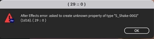 Hello so I need help, I am trying to apply this effect into my clip and it tells me "After effects error:asked to create unknown property of type "S_Shake-0002" (1d16). ( 29 :: 0) please if you have any answers to why this is happening or how to fix this please reply