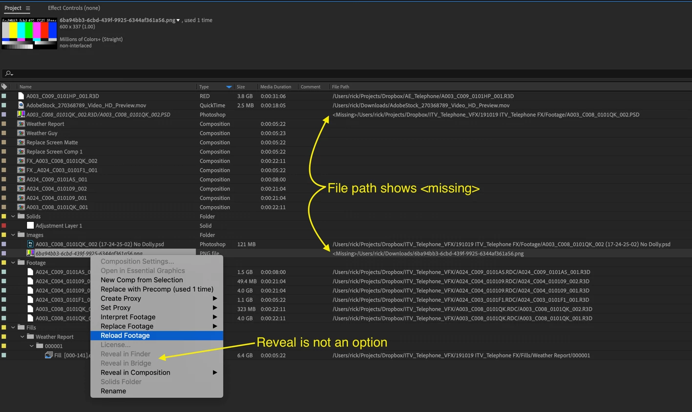 I'm working on a project that originated on a Mac. I uploaded the entire project file to Google Drive and then downloaded it at home to work on my PC. When I opened the project, AE couldn't locate the files, so I replaced them with what was downloaded from Google Drive. After all of that there is still a Overlay of Color Bars on top of my project. I can't figure out how to remove them. All of the files have been reconnected.