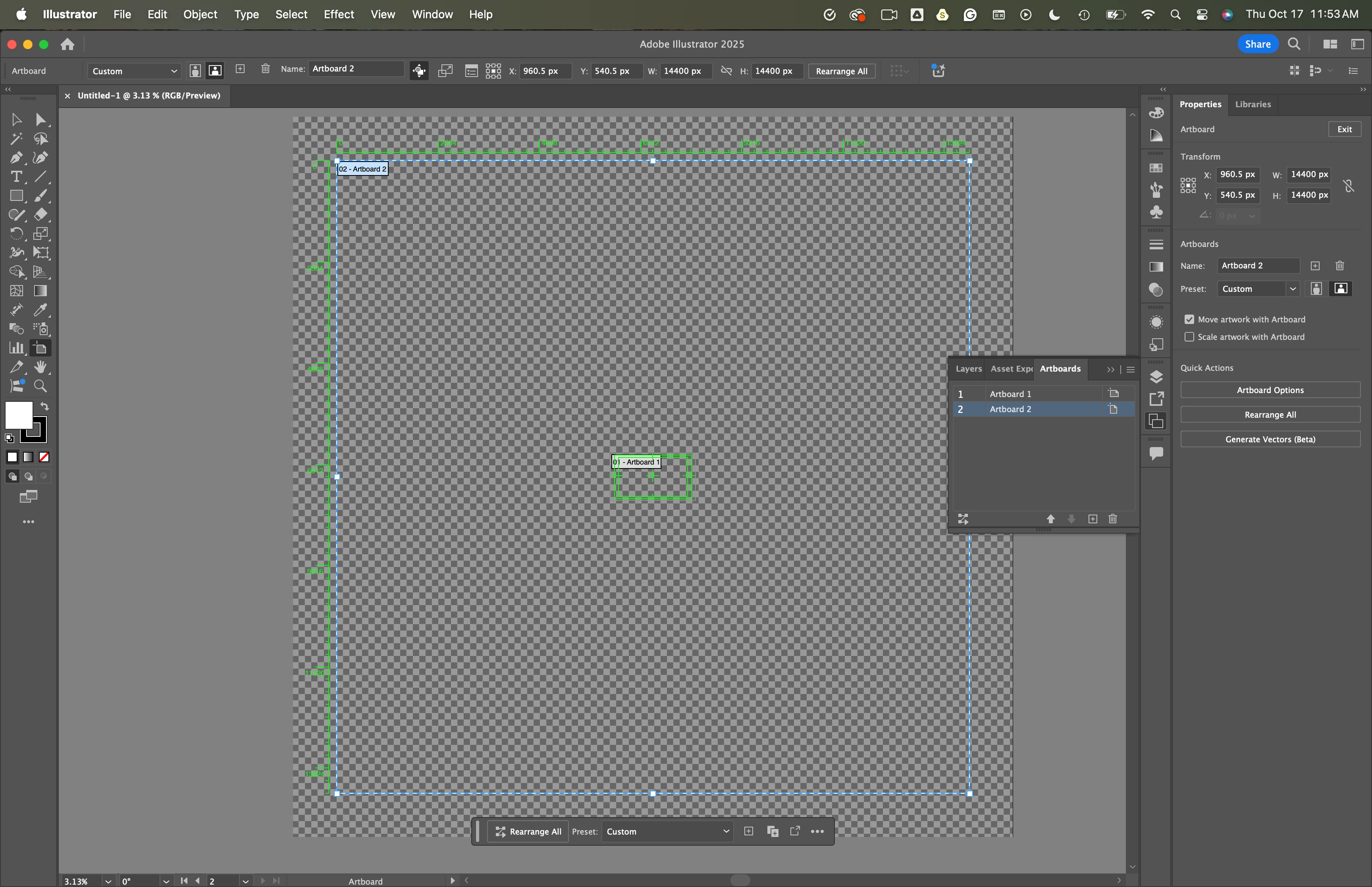 or make a new doc with a new artboard and copy/paste everthing to that for the weird ribbon board sizes (like 16000x24).