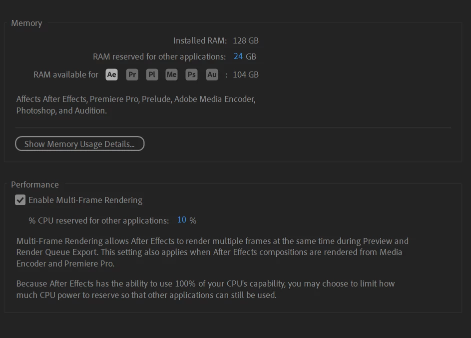 My CPU is i9 14900k with 128 GB RAM. I have AE set to render multi frames simultaneously but every time I render a preview it chugs through the images one-by-one, using very little CPU and taking forever.