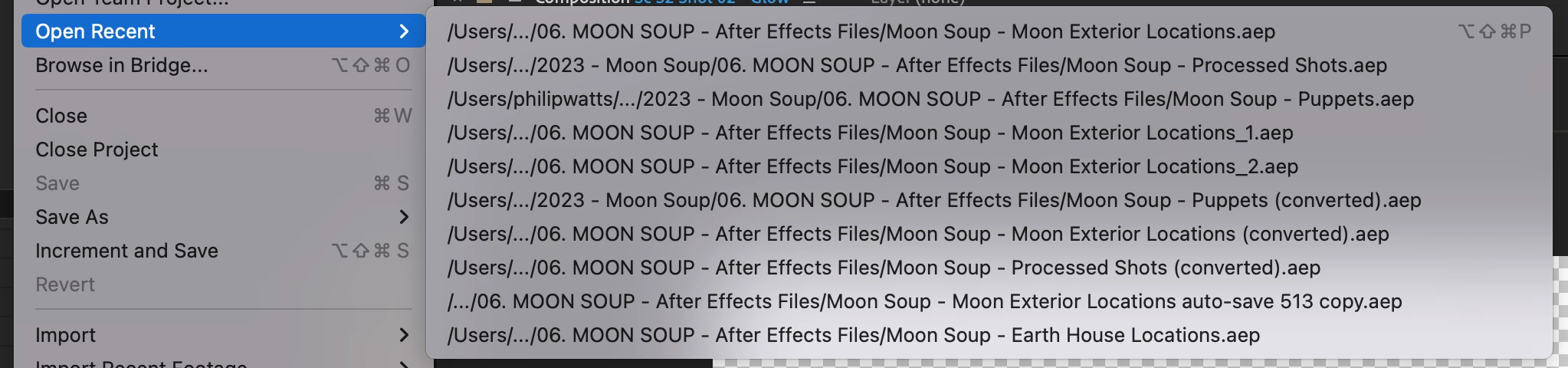 Is there a way to clear the list of projects in the the File / Open Recent menu? In the example below the menu lists projects that I have long since deleted, but also older versions of projects kept as a safety - ones that I certainly wouldn't want to accidentily re-open and start working on. I'd really like to reduce the clutter.