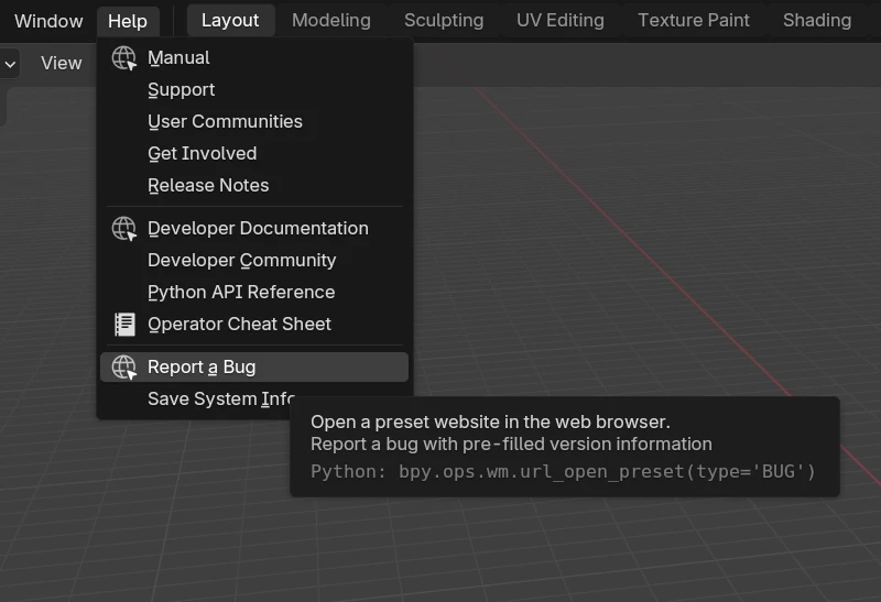 - I opened the help menu - unlike something like Blender there is no “Report A Bug” option.