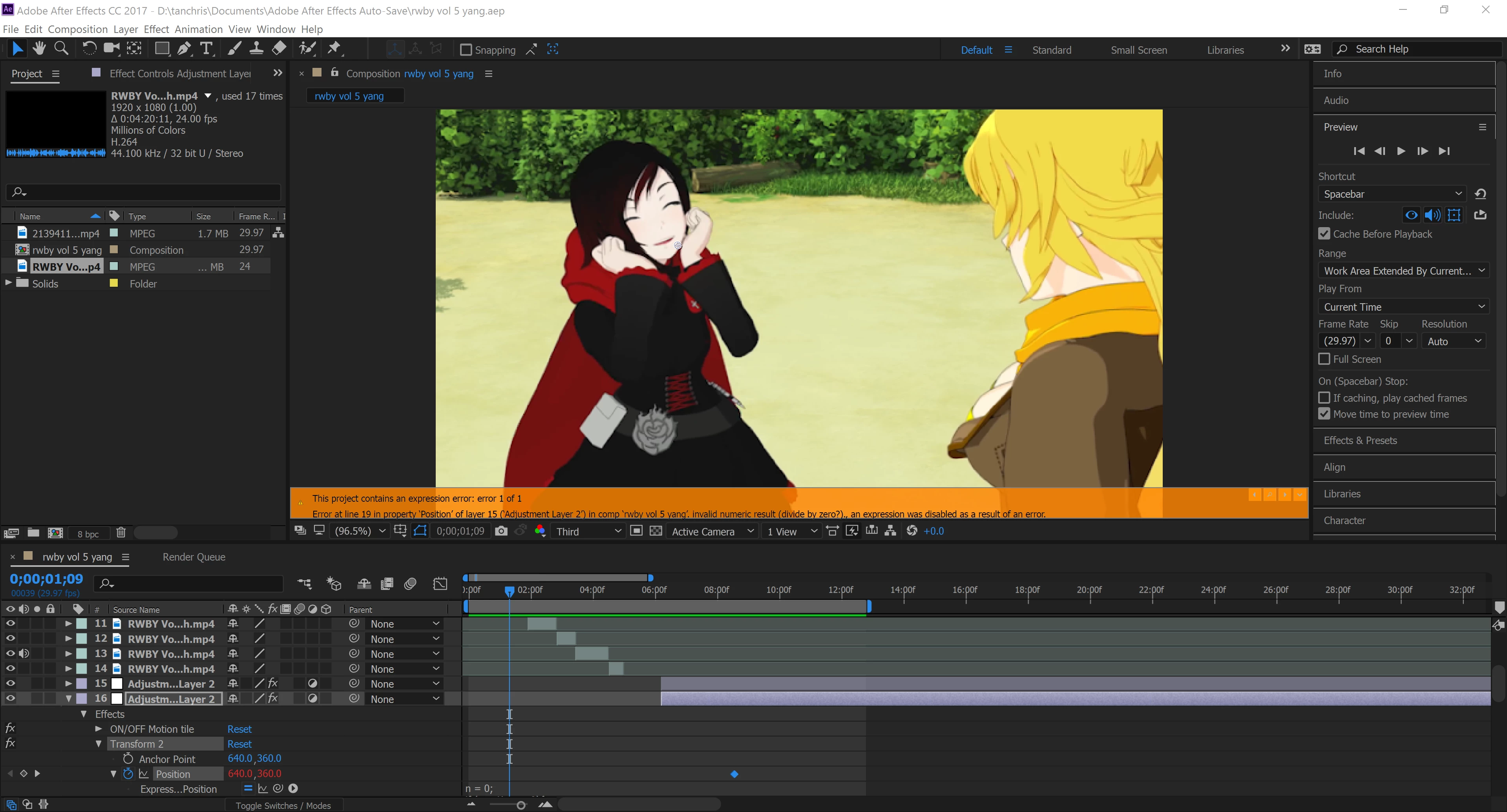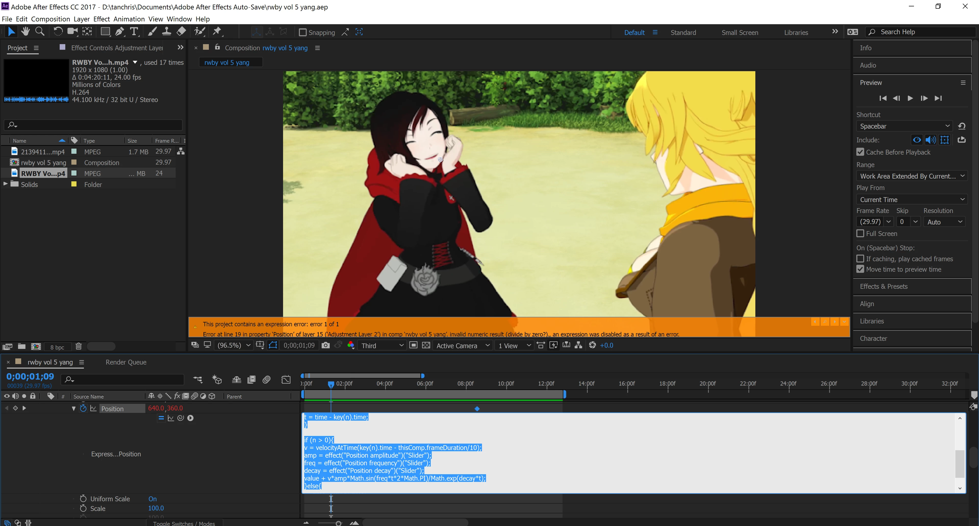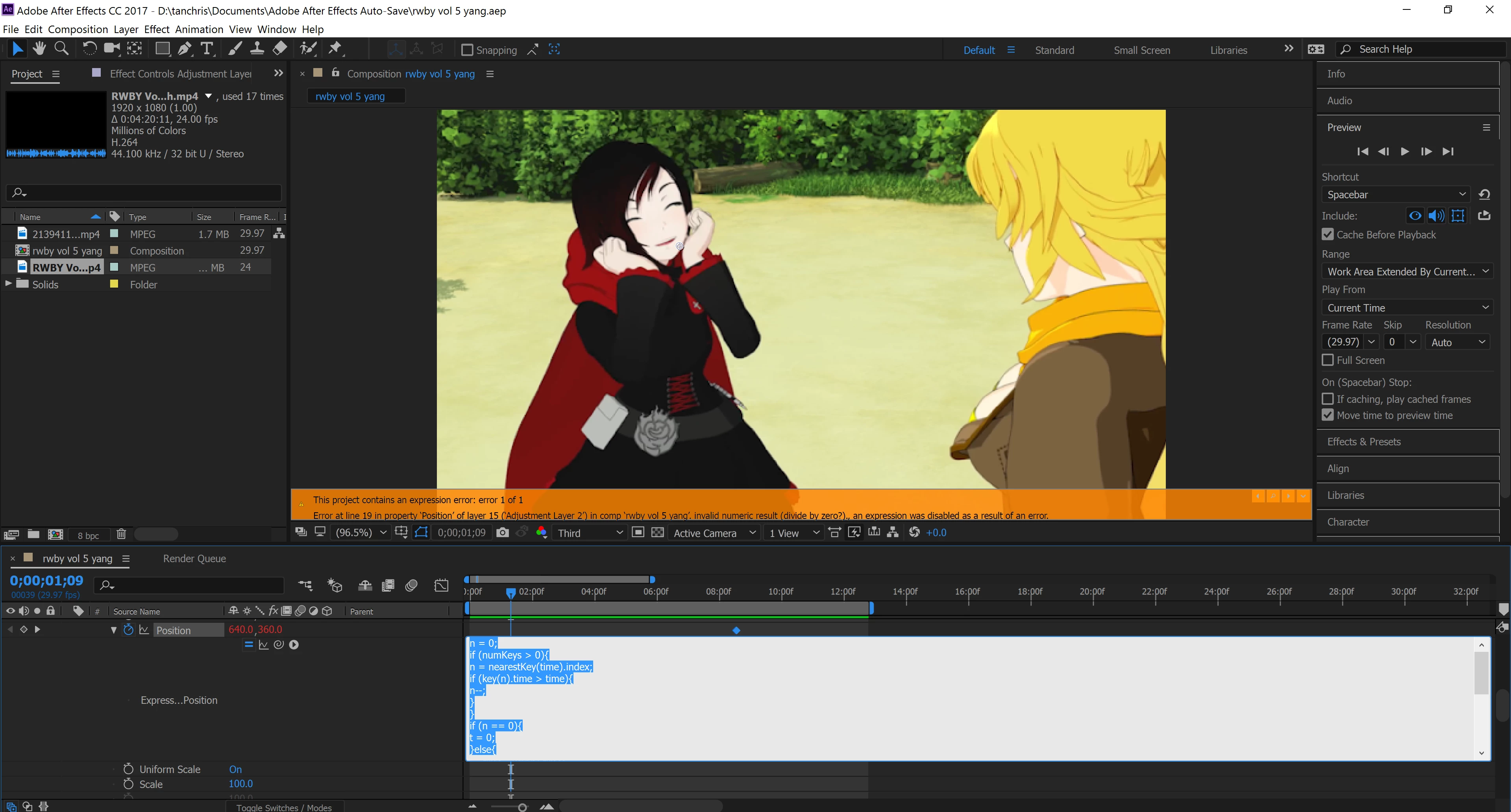 If you copy the expression from layer 15 position and paste it into the forum we can take a look at line 19 and see what is going on. My guess is that the expression references some property in your comp that somehow gets to zero. For example, if you take the x position value of a layer and divide rotation when rotation gets to zero you will get a divide by zero error. For example: