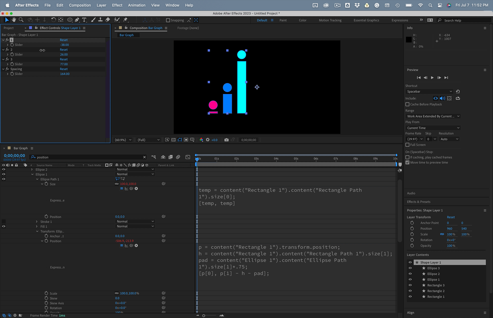 Everything works find except for onee problem. I need to have each DataDots move in concert with the animated bar as it rises to its final height. I know how to link objects to a Nulls and I have already linked the DataDots and their corresponding values to a null, but how can I link the null to an object (each vertical bar)? Linking the null to the top of the vertical bar would be ideal but After Effects will not allow me to do that. Using PickWhip to link the "Position" property of the vertical bar to the "Position" property of the Null Layer fails.