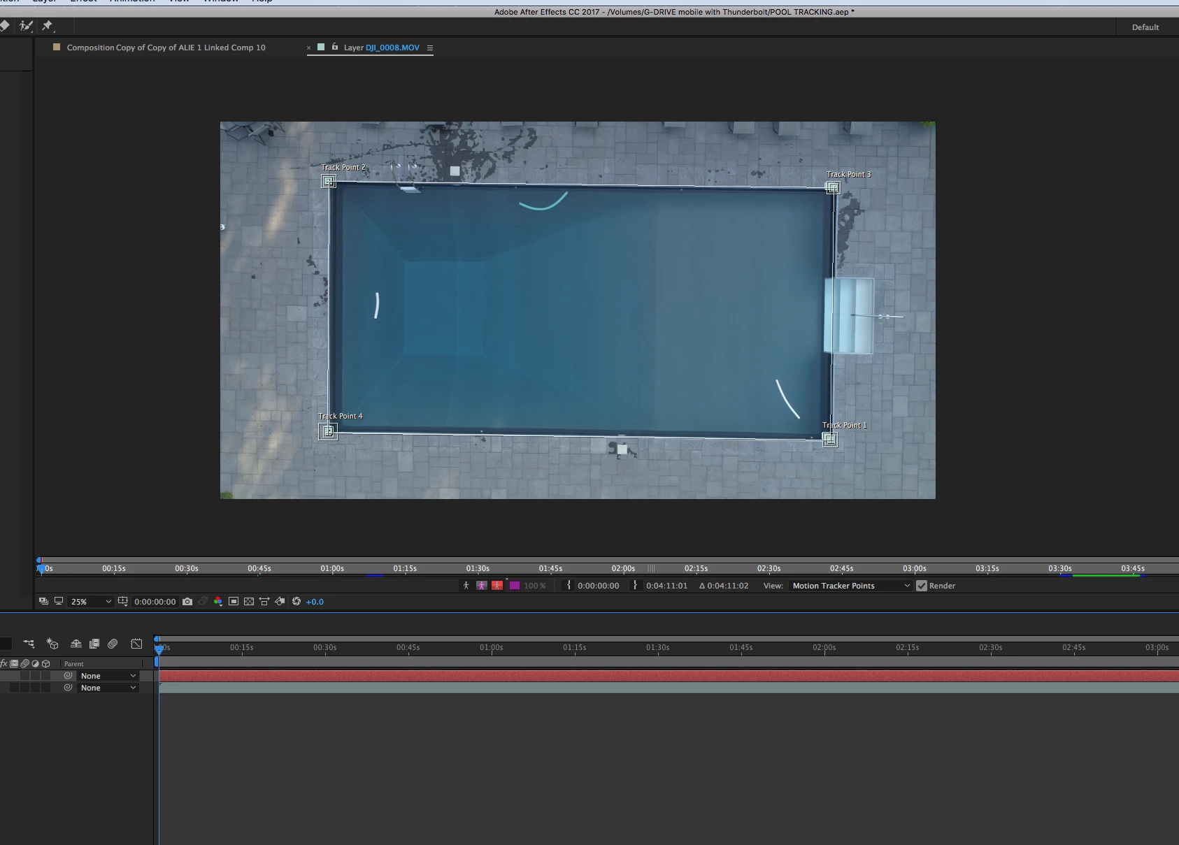 Hi, so here's the situation: I have drone footage of a pool...facing straight down, God's eye perspective. It's five minutes long, and we shot the footage in tripod mode on the drone, but the camera slowly drifts throughout the footage. I would like the four corners of the pool to be locked to a particular place on the screen for the whole 5 minutes. I assume this is easier to do because it is essentially a 2D shot. I'm new to after effects, and attempted using 4 corner pinning to track the points. Now I'd basically like the footage to rotate and scale in order to keep these 4 points locked to four screen coordinates (essentially leaving an inch of ground around between the pool and the frame of the screen.) Any input would be much appreciated, thank you. A screenshot below: