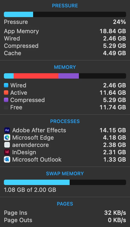 Hi I have a relatively new MacBook Pro M1 Max with 32GB of RAM and am experiencing the orange Low memory warning banner on my composition while attempting to render previews. From what I can tell after effects is using 14.13GB of RAM, so its not exactly touching the 29GB it's allowed to access after adjusting my settings.