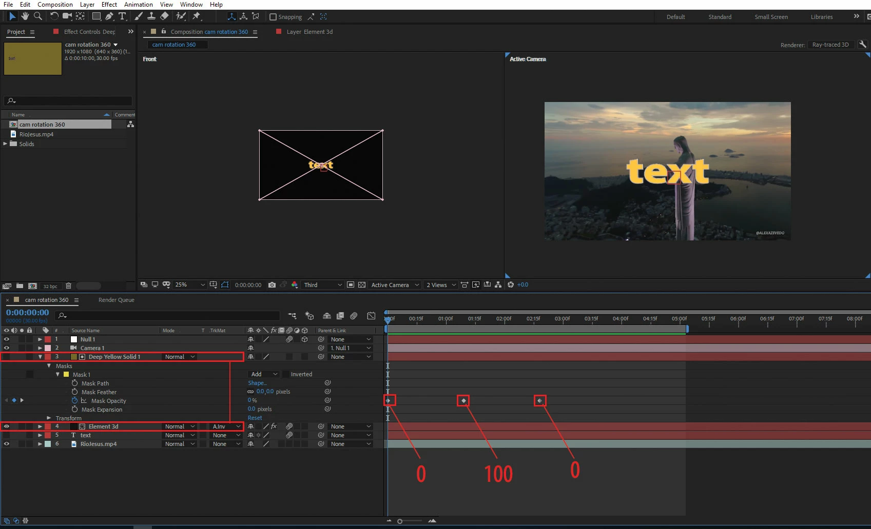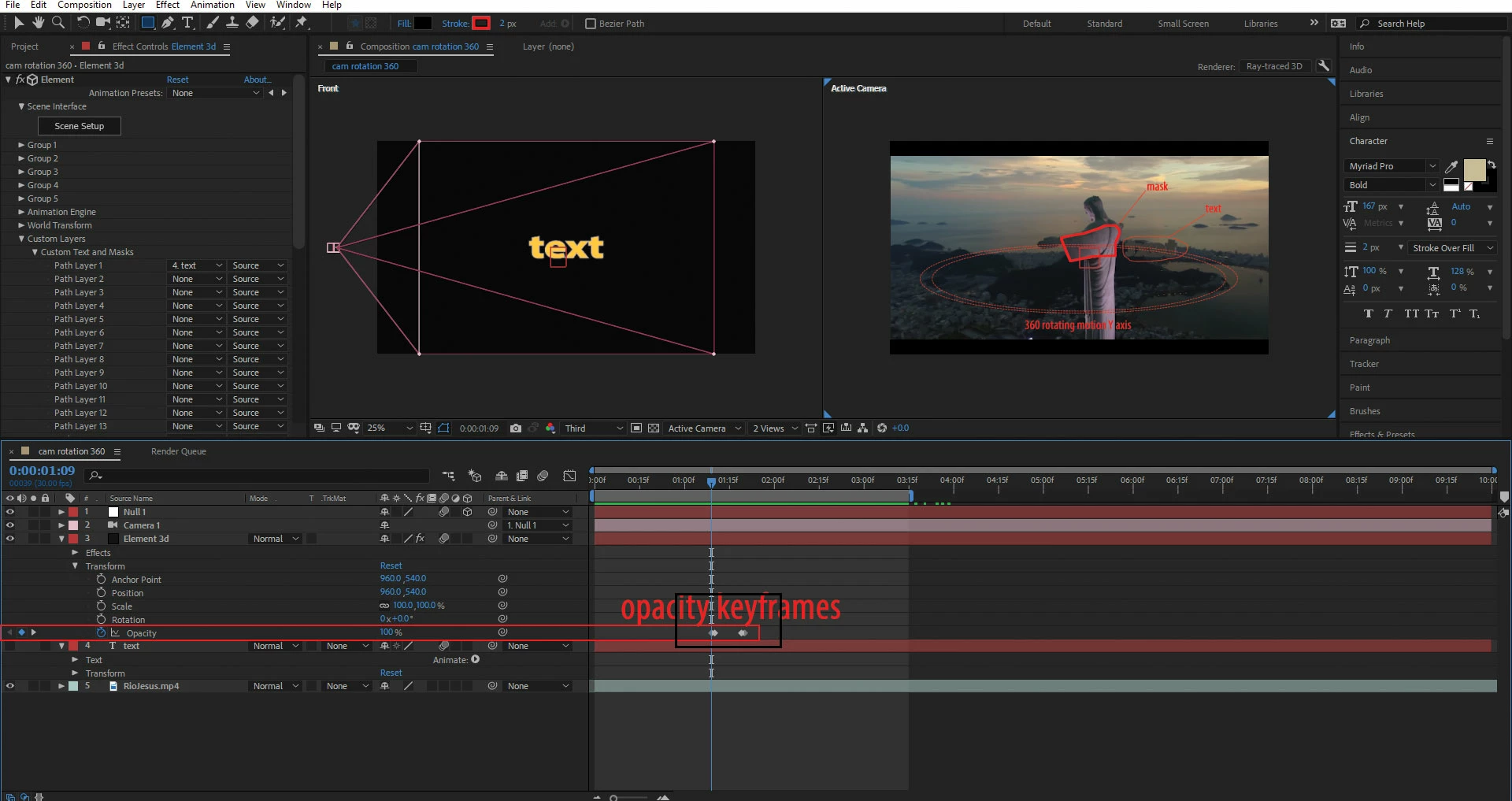 mask the section when the text makes the rotation at the point of the statue. So what I did was, as seen in the video link I have provided, I played with the opacity settings and made it seem like it is disappearing when it gets to that certain frame. and reappears as the text rotates into view again. But I'm keen to know how to