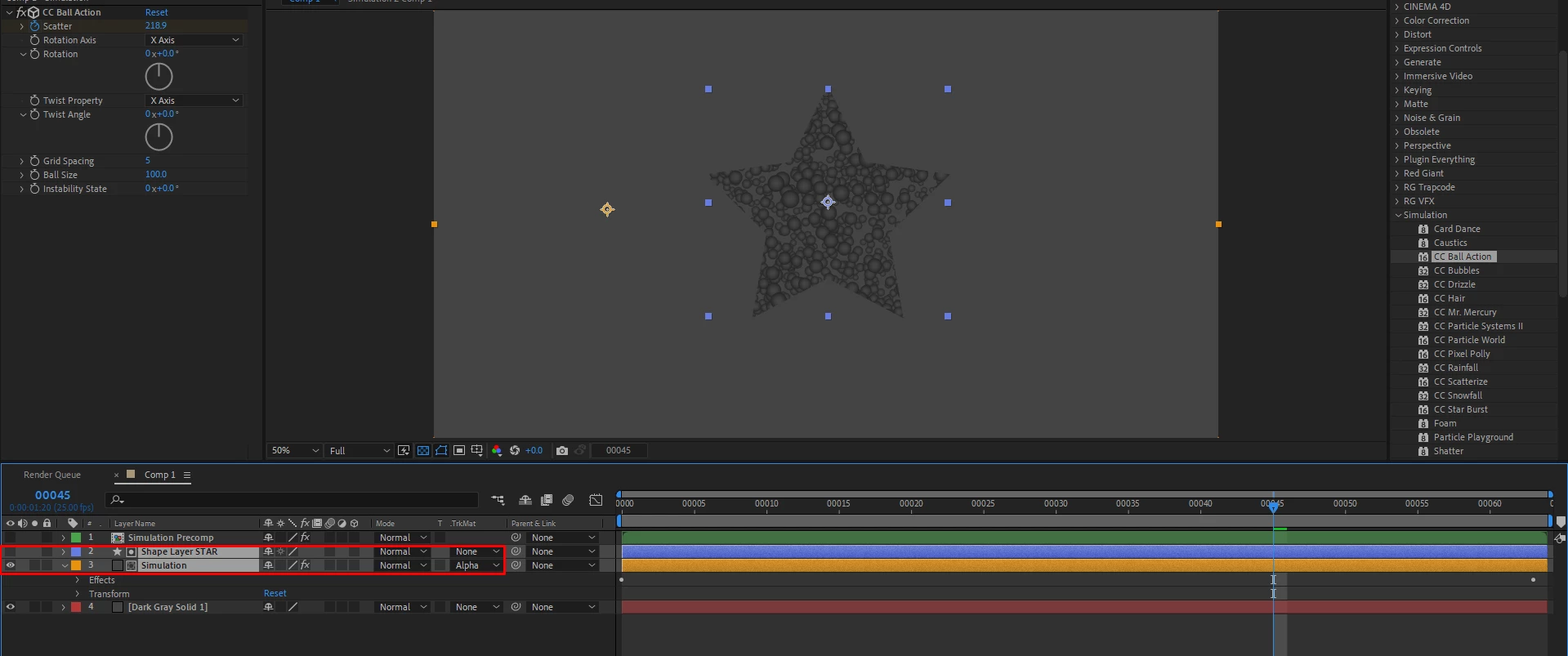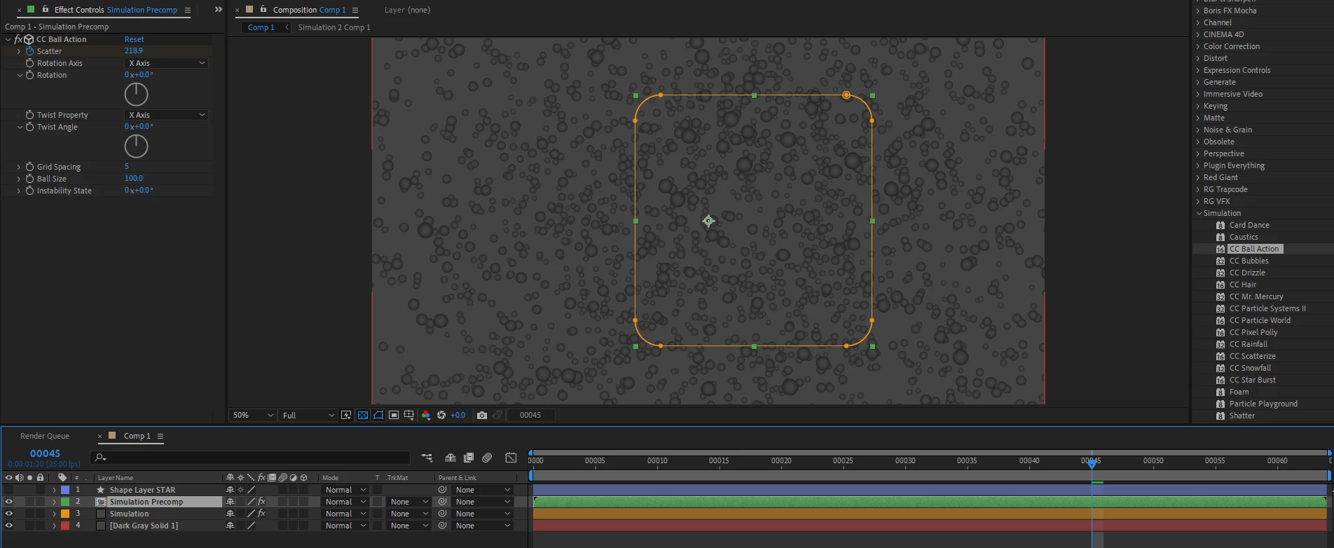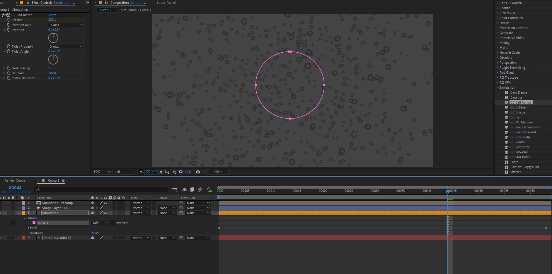 In the first example below with layer 3 (oragne colour), ball action simulation is applied, and I tried to create a mask with my solid, but nothing happens. I tried with this mask, because it gives options for feathering.