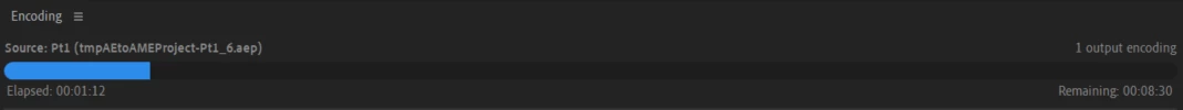 Hi there, my current issue is that when I export after effects files over to media encoder to be processed to mp4 files it would not load. Above is a sample of a single part being rendered and stuck at 1.12 minutes for over 5 hours. Most of my other AE files do not do this and only this file has this issue.