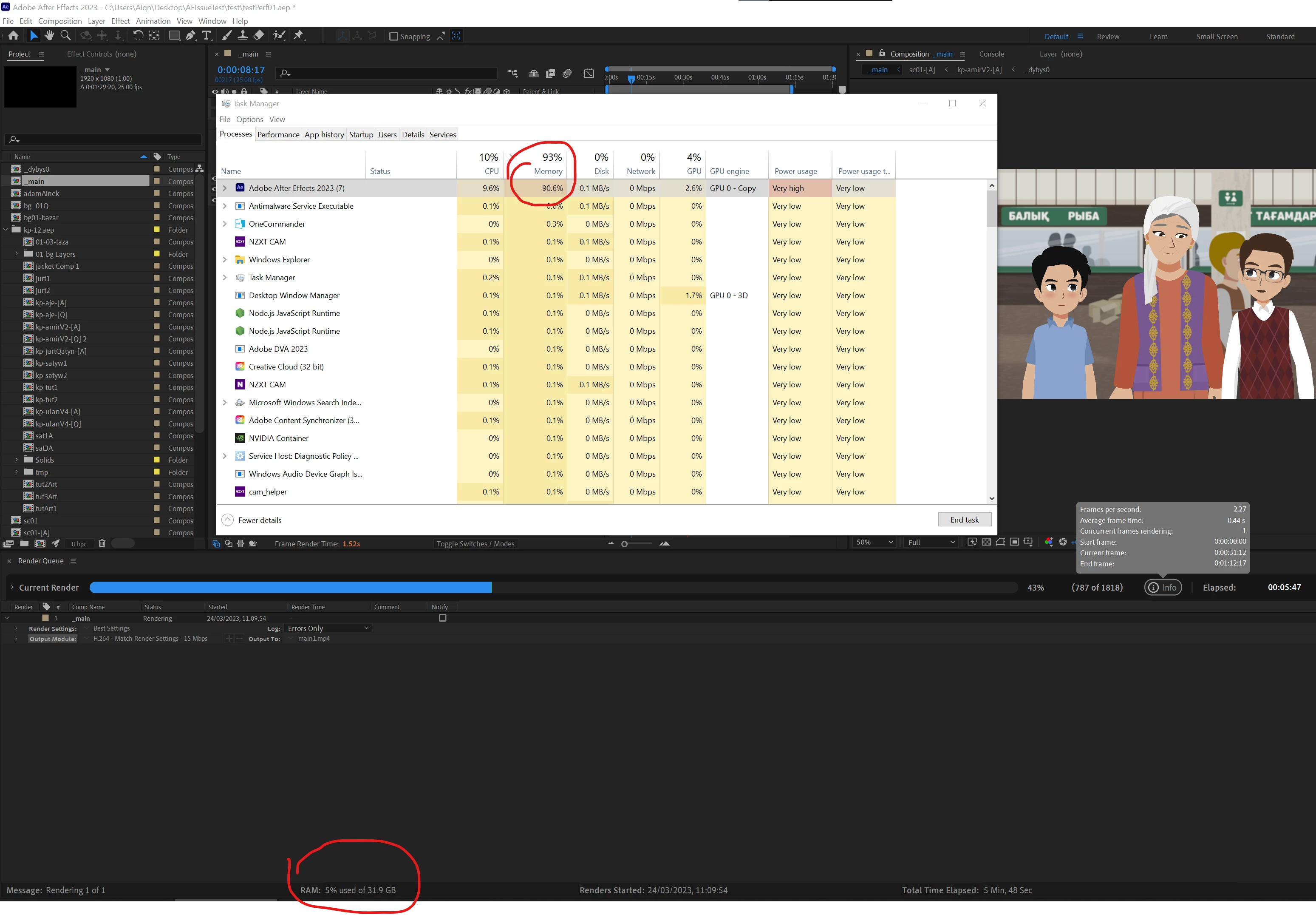 Hello. When render starts it load my CPU about 30-50%. As soon as the Memory (RAM and memory of GPU) fills up, performance drops sharply. CPU load is 5-10%. Multiframe rendering stops working, render is on only one core, AE shows 2 fps, but truth is 0.2 fps. At this point, a lot of "Issuing Purge Request" and "Purge not freeing anything" messages appear in the AE console (AE has console!). This behavior is the same in all my projects.