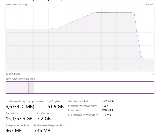 Even though I set it to "let other programs use 12GB", here you can see how much of my 64GB were used only by After Effects right before I closed it (because it gave me, once again, a memory error. It couldn't finish the render of a proxy clip, because that process, again, didn't care about available memory at all), on a freshly booted machine:
