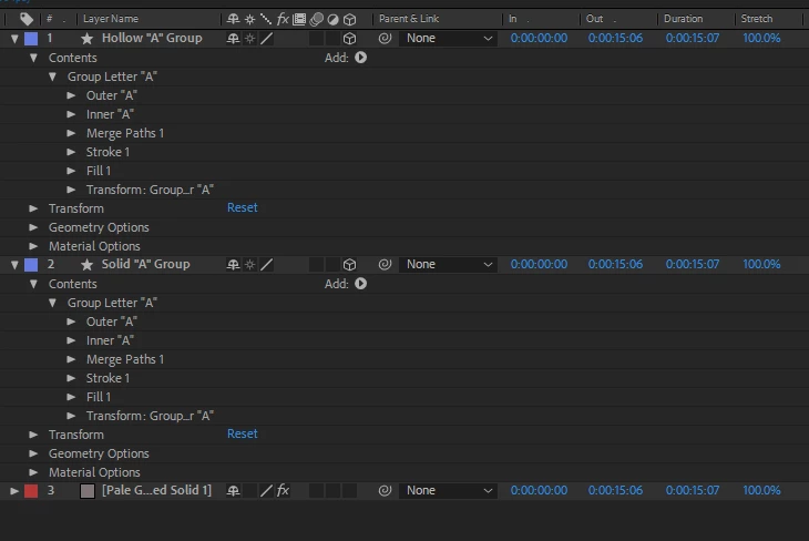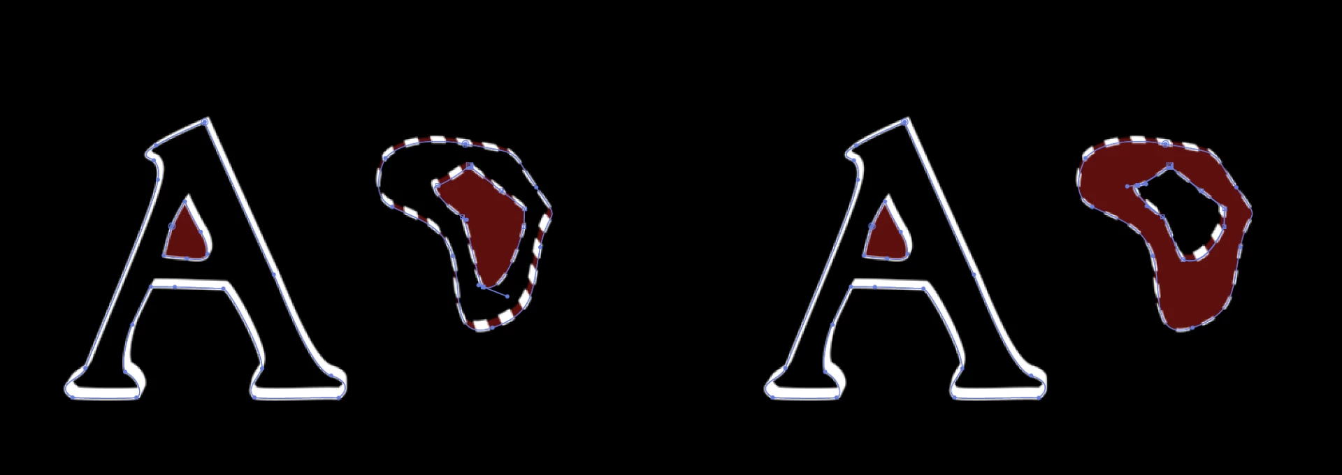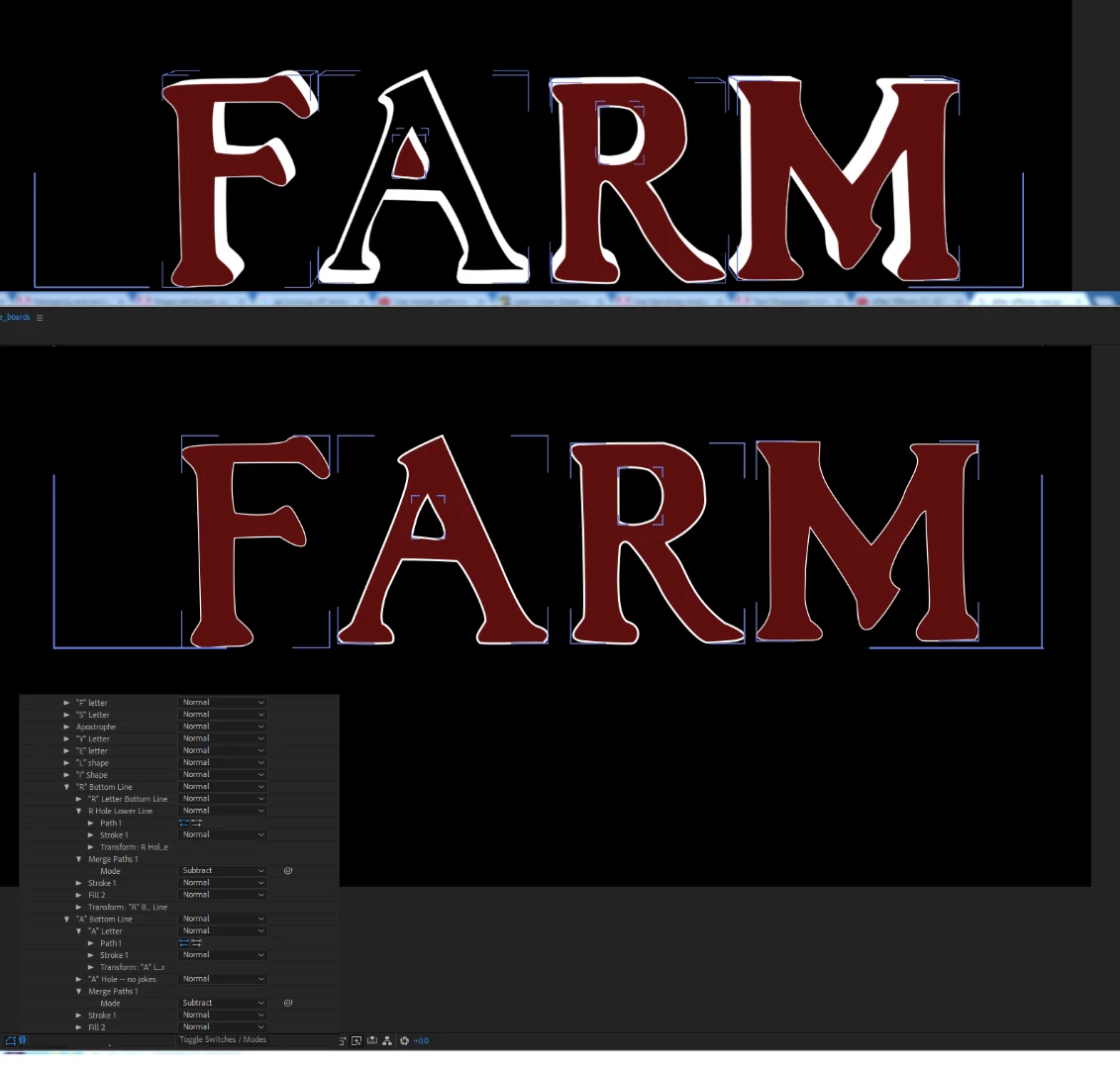 Pardon the newbie question, but I'm learning bezier editing on a shape layer in After effects and I have two groups that behave completely differently when 3D is switched on for the group. If you see the "A" and the "R" in this graphic, you see that in 2D space, (2nd image below) the hole in each letter is removed in subtract mode, but when I switch on 3D, the "A" hollows out and makes the hole solid. I've set up each group the same way, and each of the primary shape paths look the same. The "A" renders as a solid when the hole is removed. Any hints?