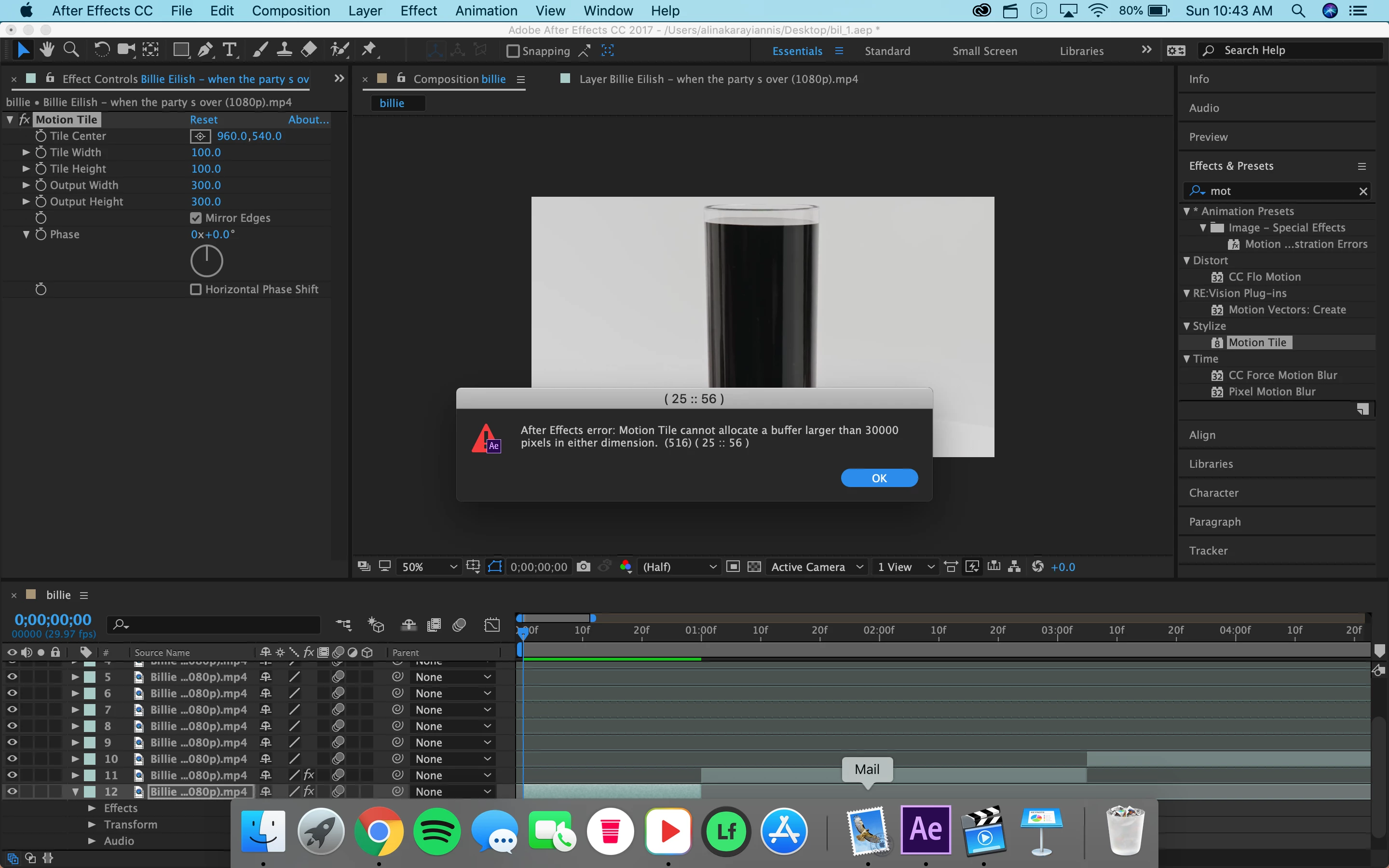 I need to use a motion tile with mirrored edges for a transition I'm making, but they arent showing up (first screenshot). Also, an error (screenshot at the very bottom) keeps popping up, even after lowering the output width and height to 200. Any help? The rendering bar is also moving very slowly.