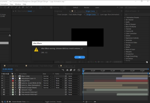 I'm receiving these error codes when I try to preview any files within this project. Even when I scrub through the CTI, none of the comps on the timeline are visible on the preview screen. I examined the boards on Adobe Community, and several other people have the same problem on 'Unknown BIB Error. invalid container, 0 (83:: 3)', but with no results. The "solution" to that special error code was deleting my font cache. I followed the steps, but the error code continued after that. I tried uninstalling and reinstalling After Effects to no avail. I also tried opening a new project file and importing that file, but the error code was displayed there. Due to these issues, my workflow came to a grinding halt. I'm past due on the delivery for a client waiting on this project. I've attached screen images of the multiple error codes that pop up and keep me from using After Effects.