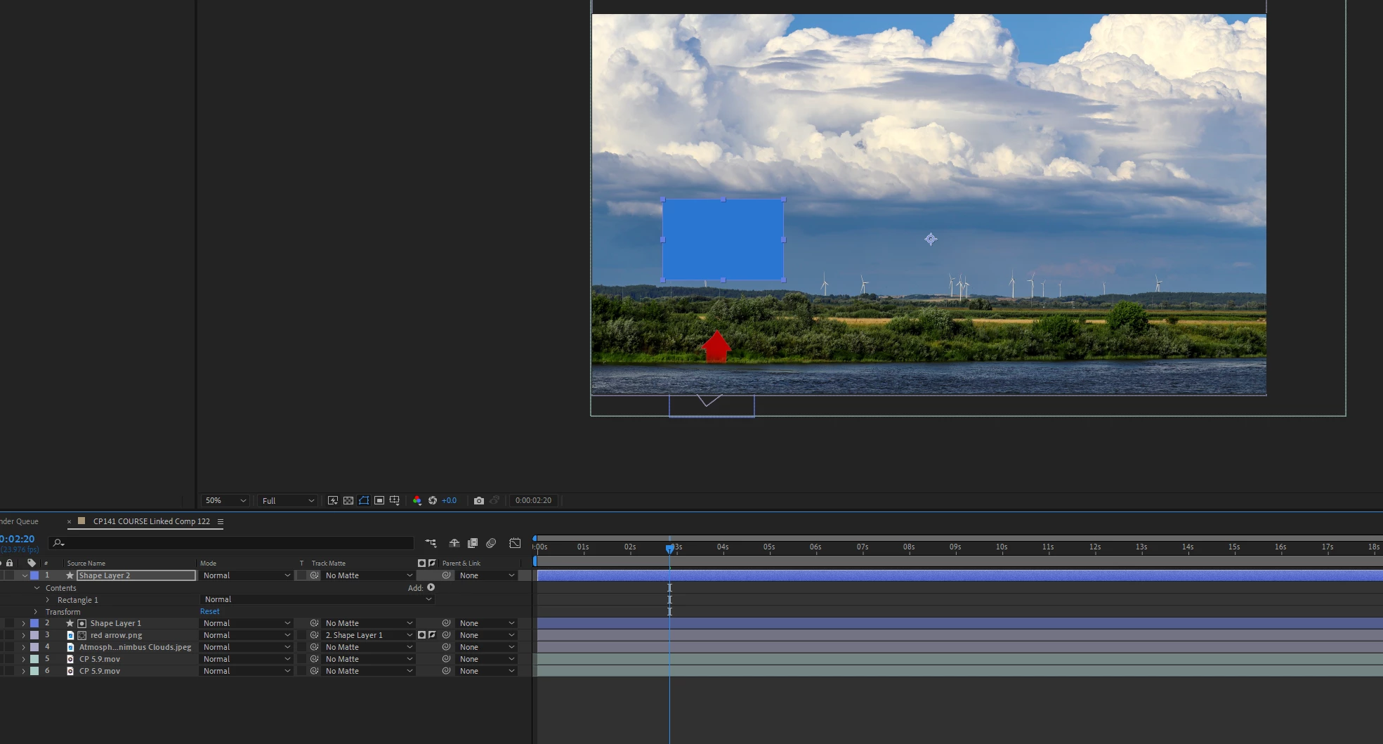 I have an arrow that I need to appear from the bank of the water and rise up which I have done. I have Shape Layer 1 that the arrow comes up from. The red arrow is set to Shape layer 1 and the Alpha Matte is inverted.
