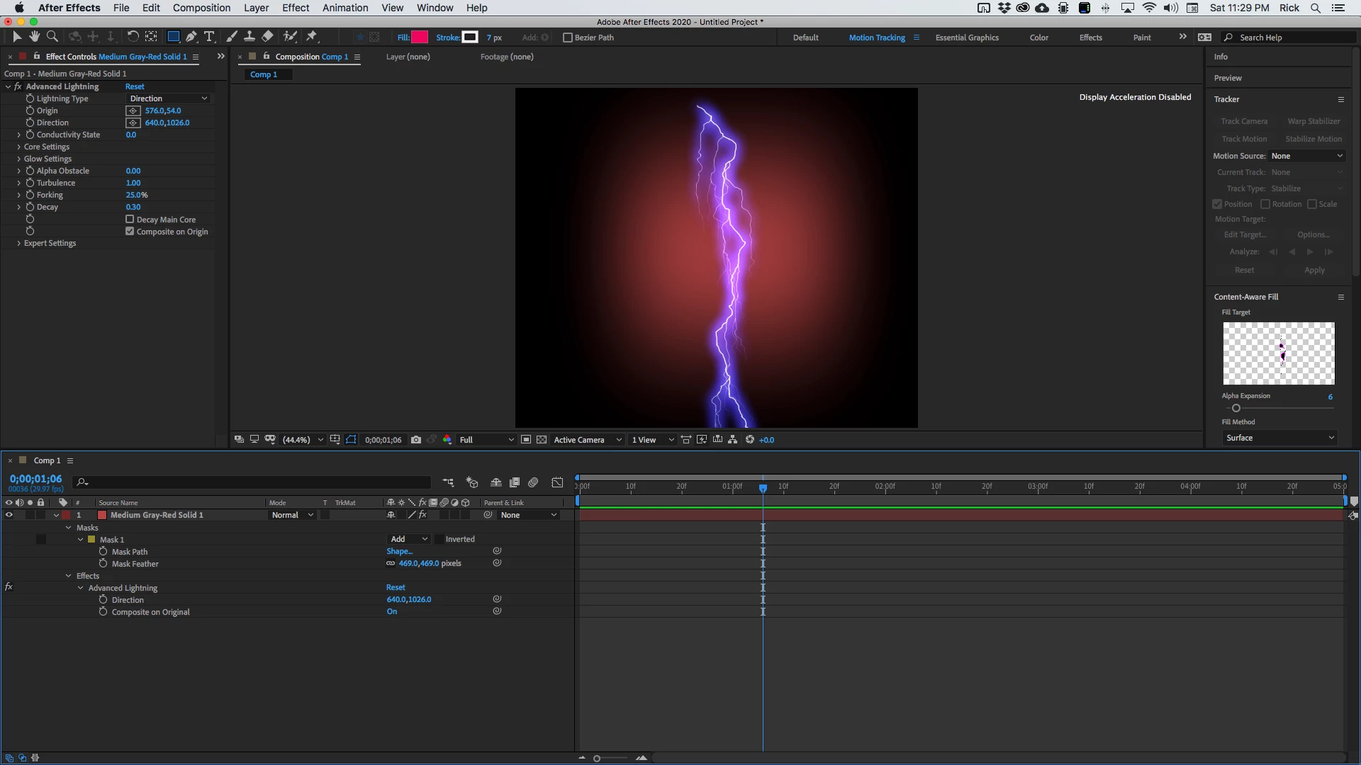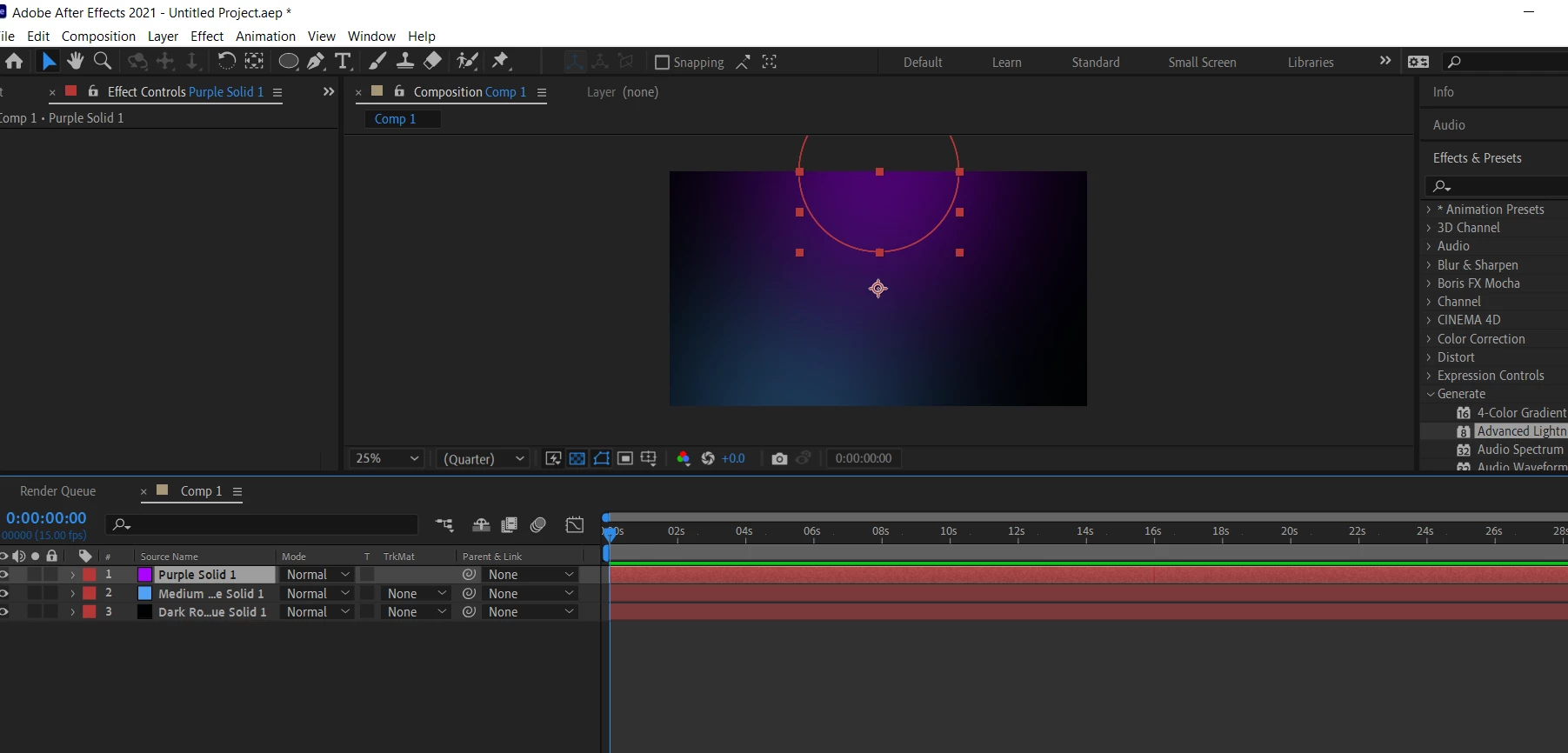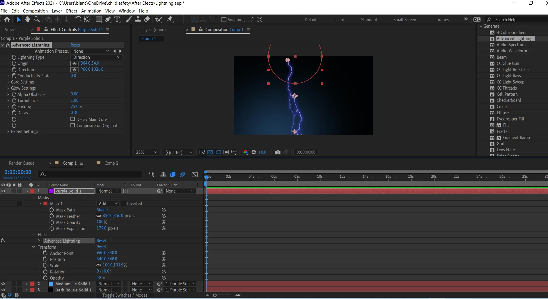 I have followed a tutorial for creating a nice background using solid layers and then adding a mask to each layer. I'm happy with how it looks now (see pic) and want to add a lightning bolt effect on top. Every time I try to do this something goes wrong. Can someone please help me?