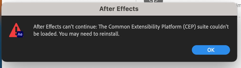 After Effects can't continue: The Common Extensibility Platform (CEP) suite couldn't be loaded.