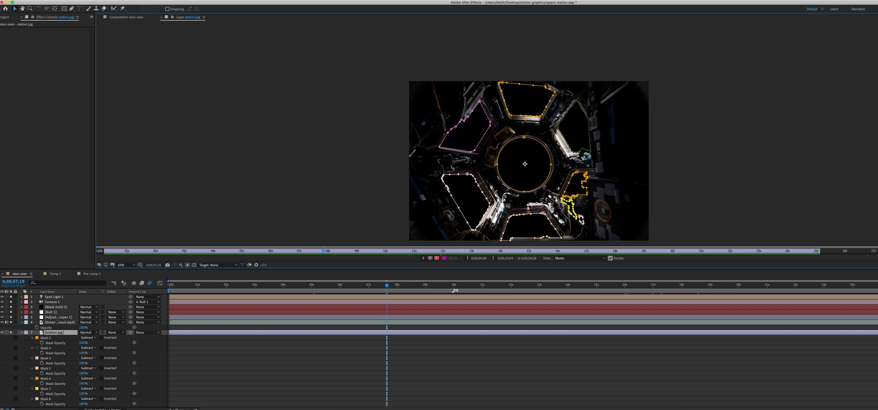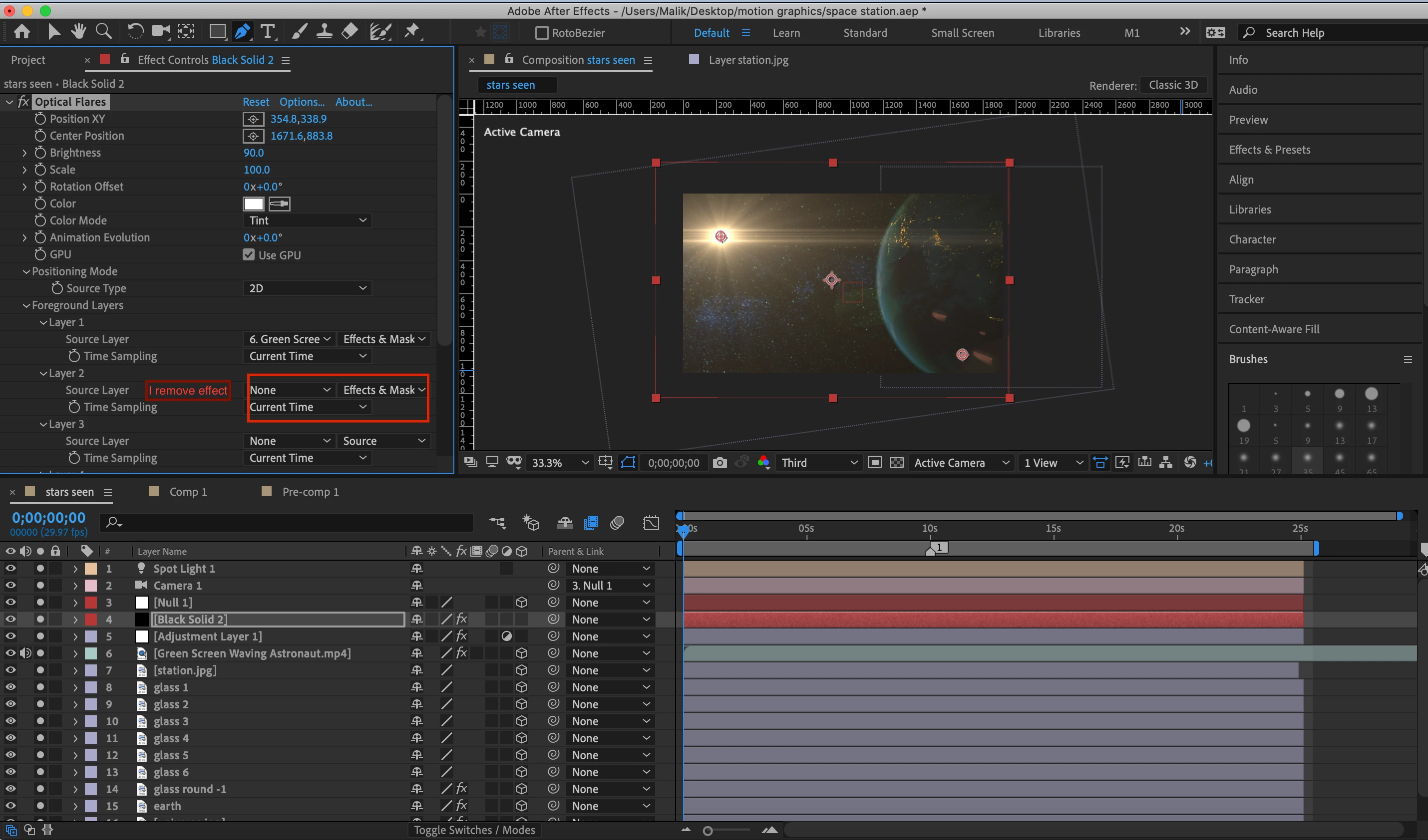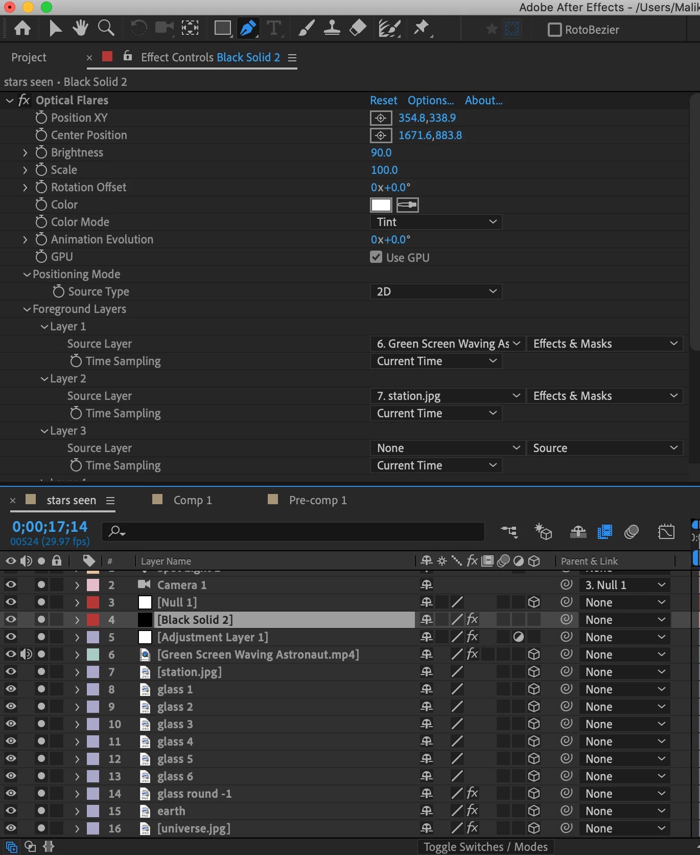I tried to pre-compose but I lose the foreground type: effect and mask of the space station. So how I can keep my optical flares working all the way in the composition with the desired effects on other objects?