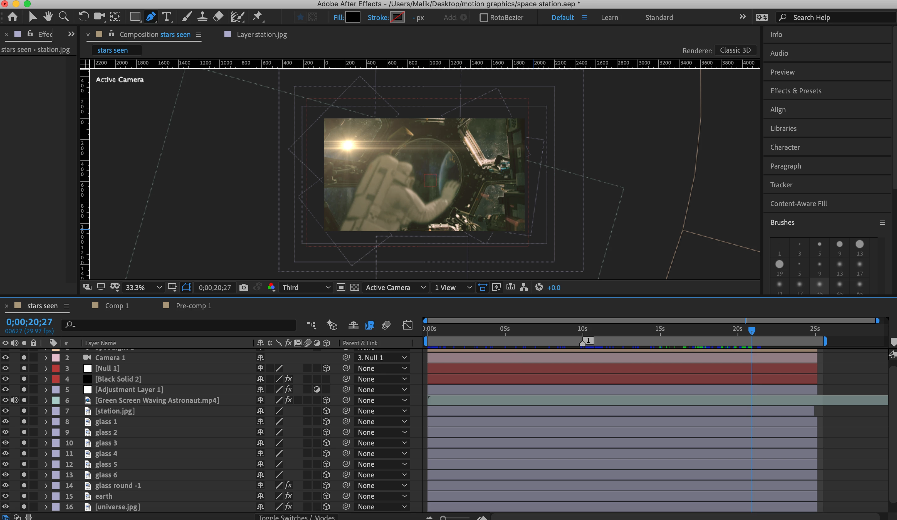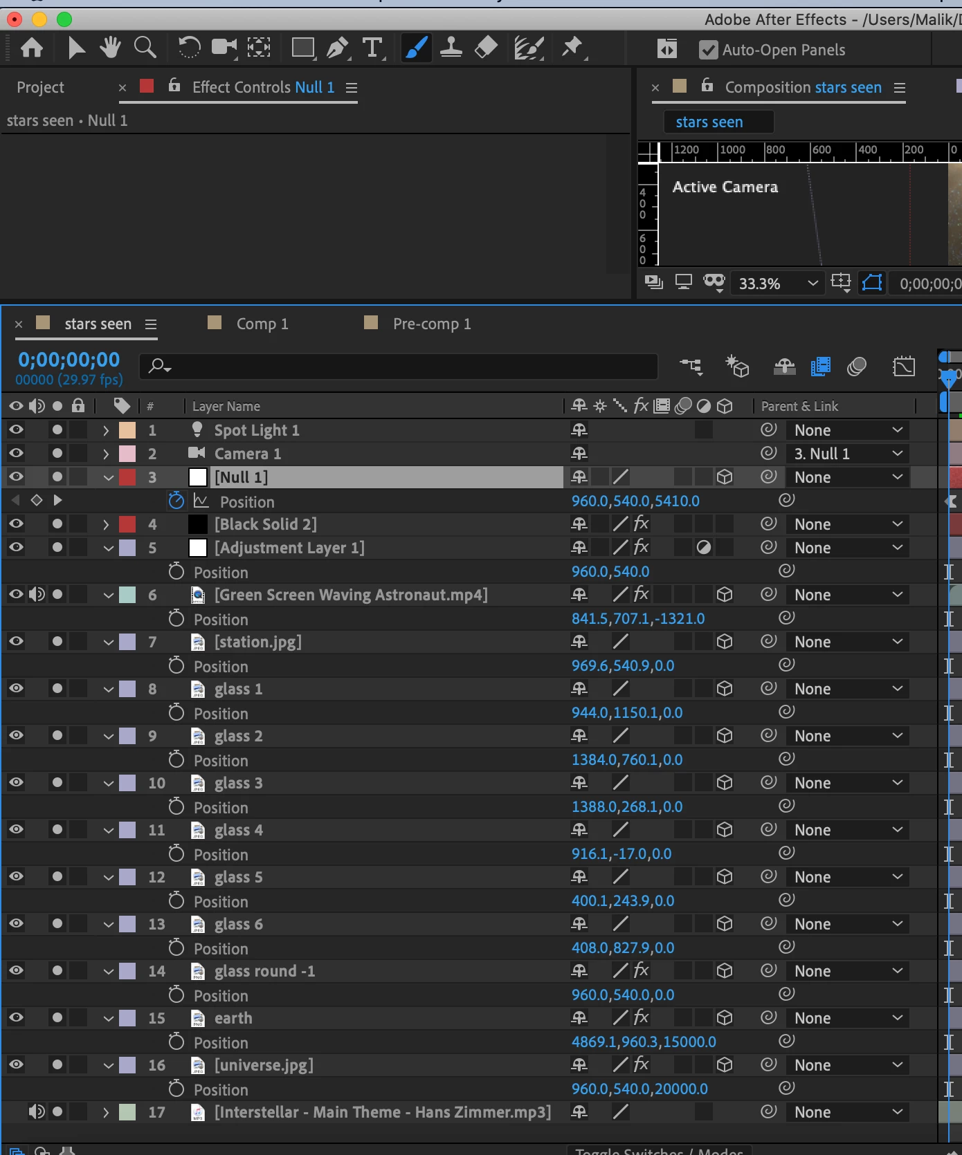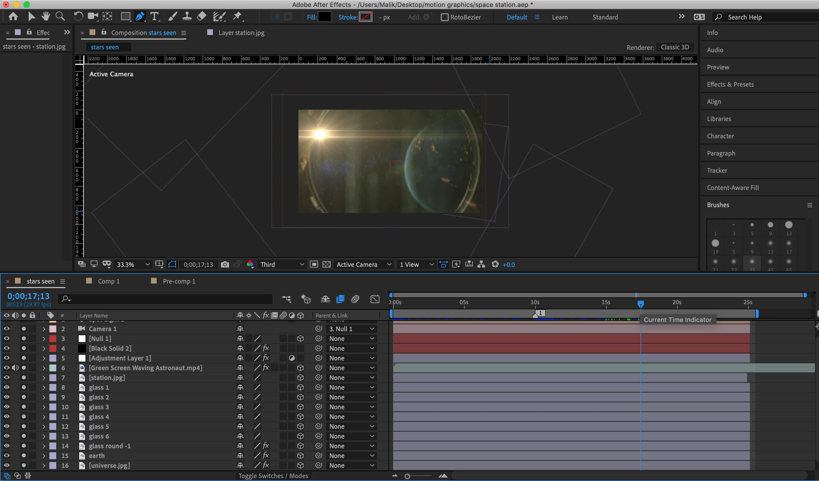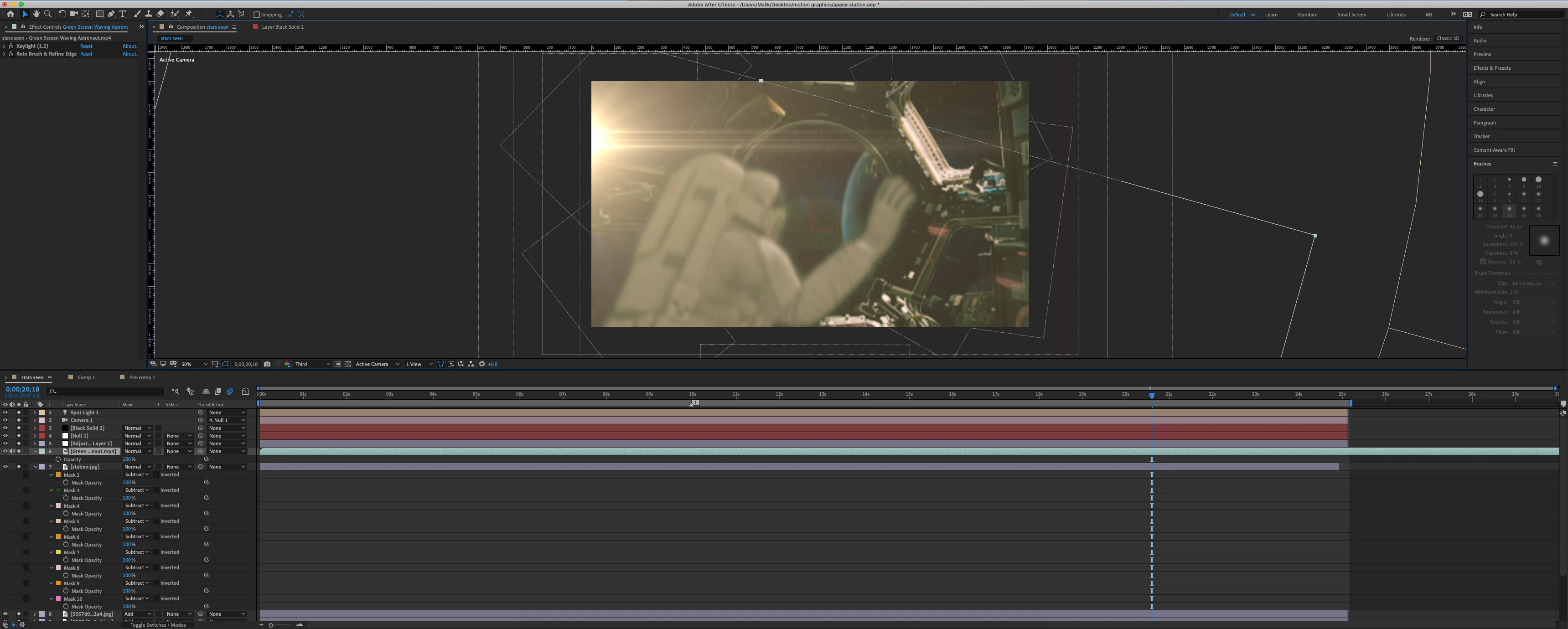 I tried to pre-compose but I lose the foreground type: effect and mask of the space station. So how I can keep my optical flares working all the way in the composition with the desired effects on other objects?