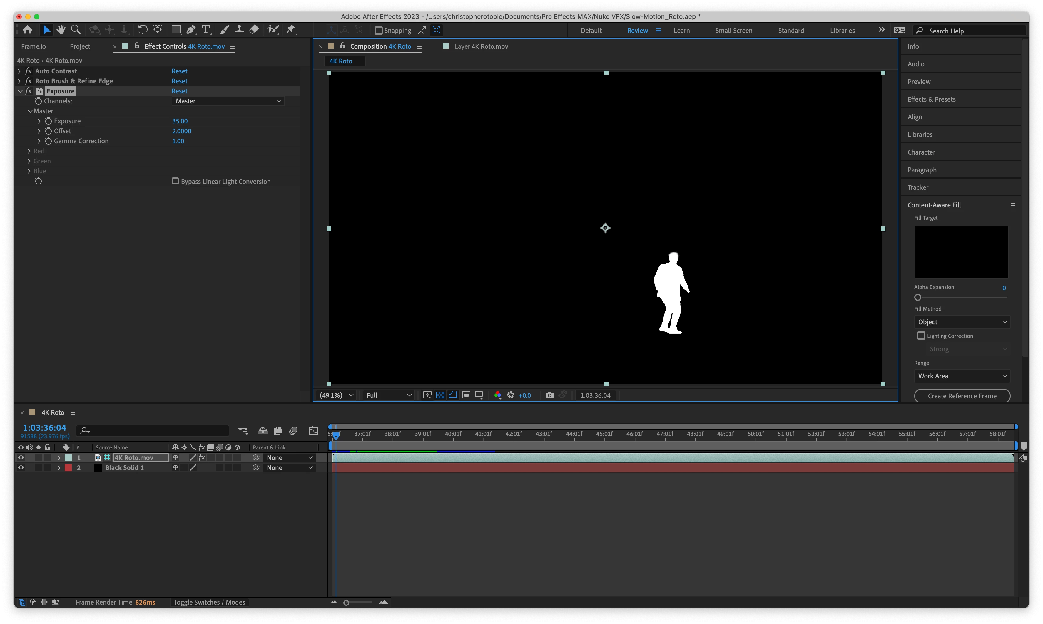 Hello, I have a fairly lengthy video (around 600 frames) that I have spent countless hours rotosoping with Rotobrush 2.0. And what I've done, is rotoscoped myself out, then when I've frozen Rotobrush, I put an "Exposure" effect on the video, and cranked the exposure up to 35, and the offset to 2. And now, I have my rotoscoped figure as pure white, and after that, I placed a black solid behind my character and now, I basically have a mask (I'm trying to axport this as a mask for another application).