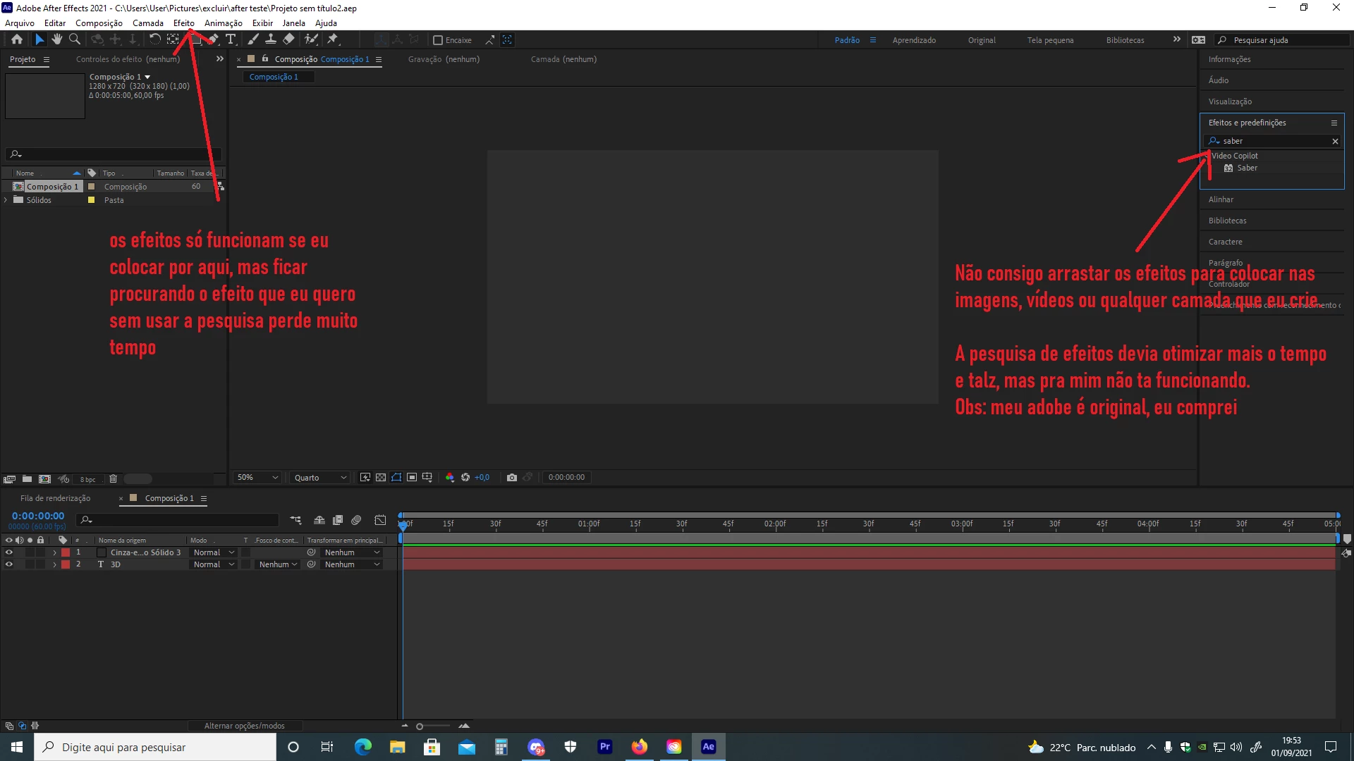 Não consigo colocar efeitos e predefinições da aba de pesquisa dos efeitos no meu After Effects