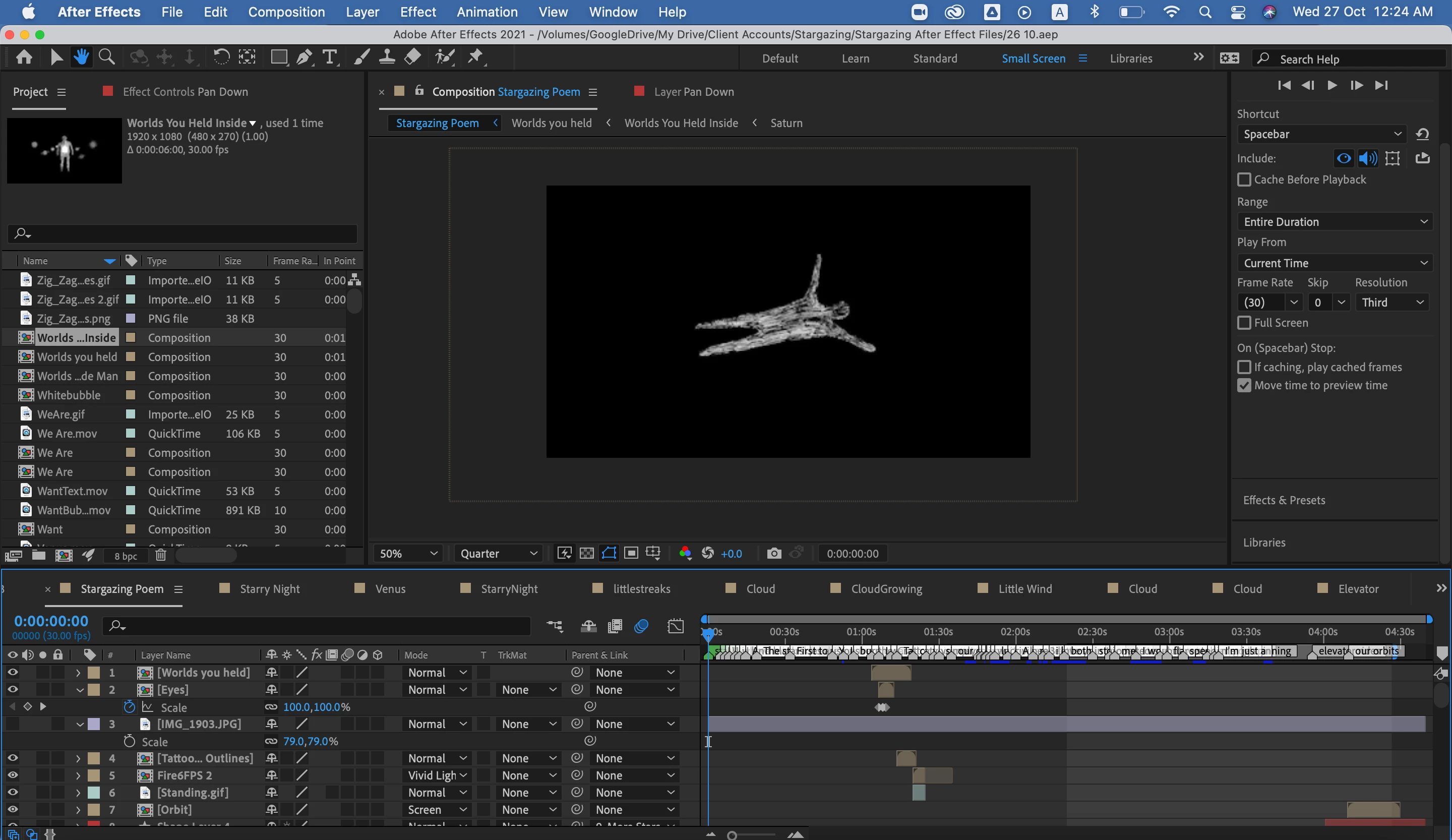 1. Yes I have audio in the comp. The period key doesn't seem to be working for me. When I press the period it just zooms in (I have a Mac)