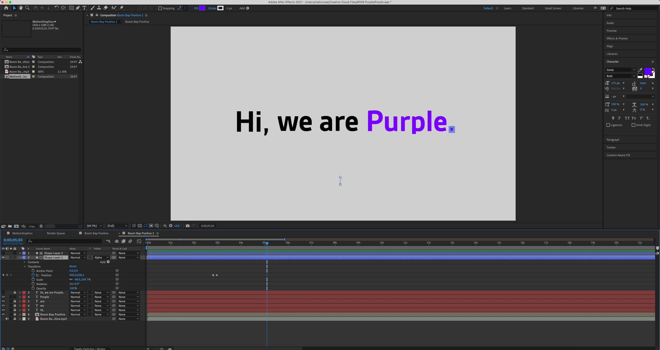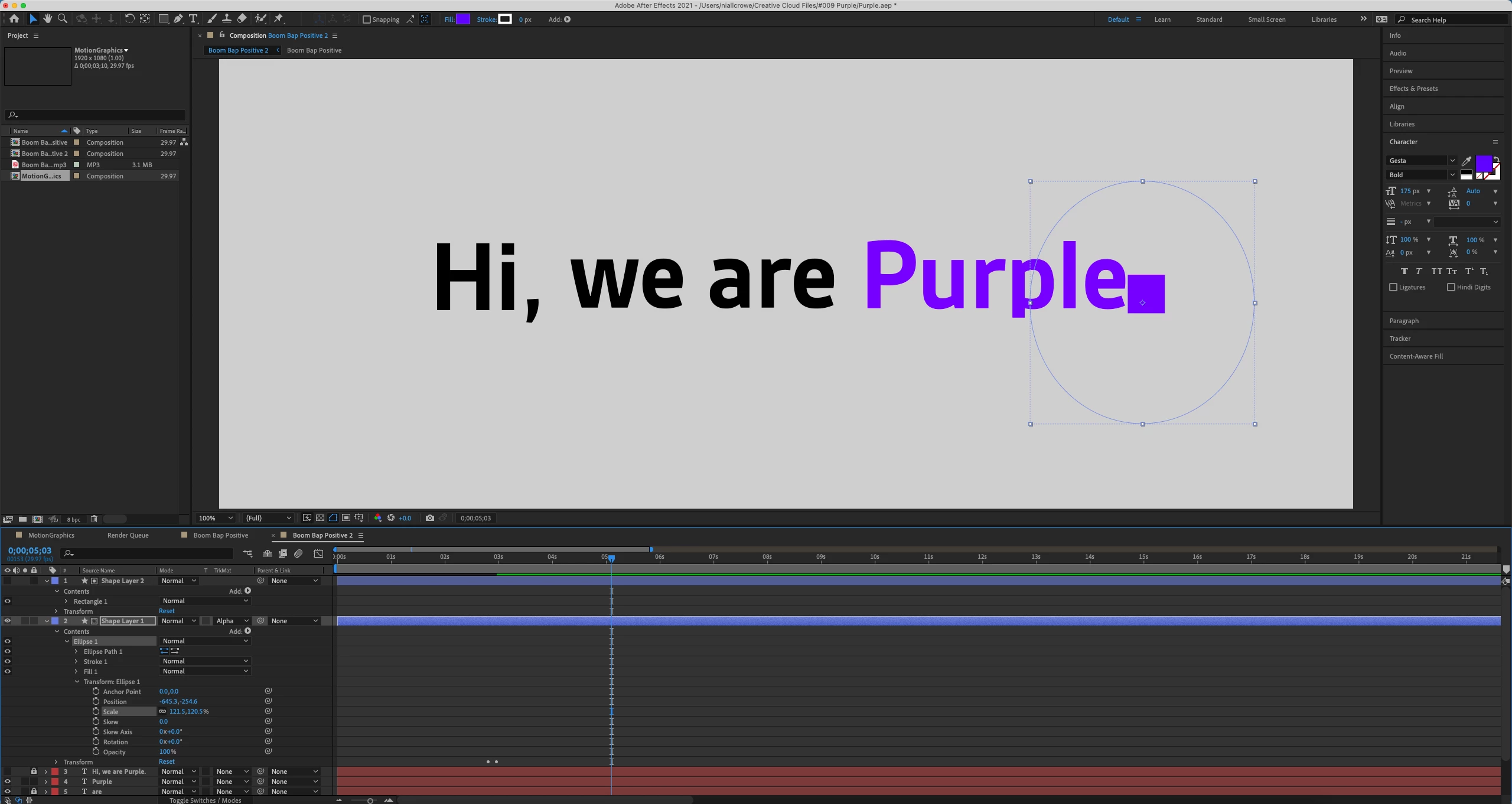 BEGINNER Need guidance on masks and scaling - I've a text animation where the text appears through masks. I've a circle shape as the full stop which was made with an alpha matte. I want the circle to increase in size so that it covers the screen and it's all purple. Any ideas? Thanks!