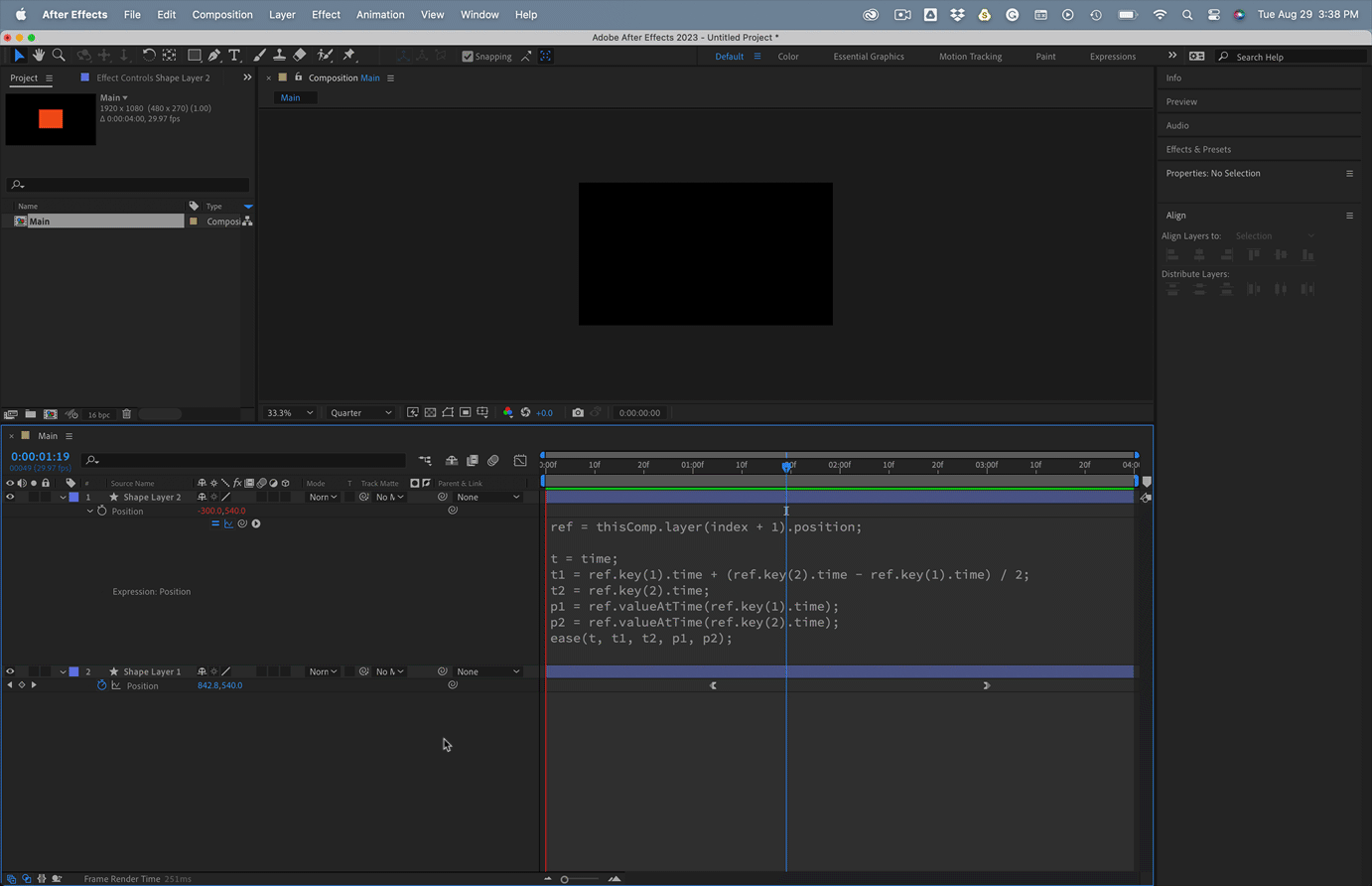 Hey there so basically I want to create an expression creating a position delay referencing the layer above using valueattime. then i want the trailing objects animation to be half that of the leading object so they arrive at the same point at the same time. I've tried a bunch of methods but I cant seem to get it to work. any advice? heres my current expression just for the delay which works fine. just need to know how to cut the animation in half after the delay. so leading animation is 12 frames, after 6 frames i want the second object to start and its animation only be 6 frames long.