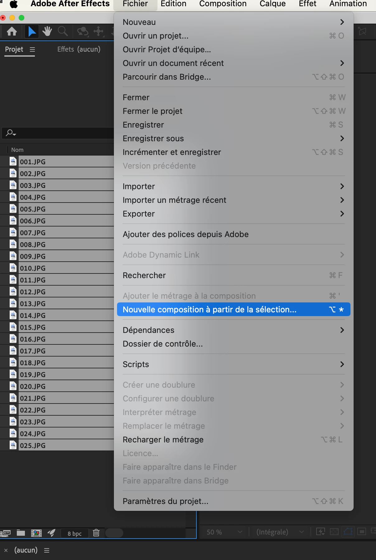 If you are trying to create a composition from the selected assets in the Project Panel and the File/New Composition From Selected menu is grayed out try using the shortcut key Alt/Option + \