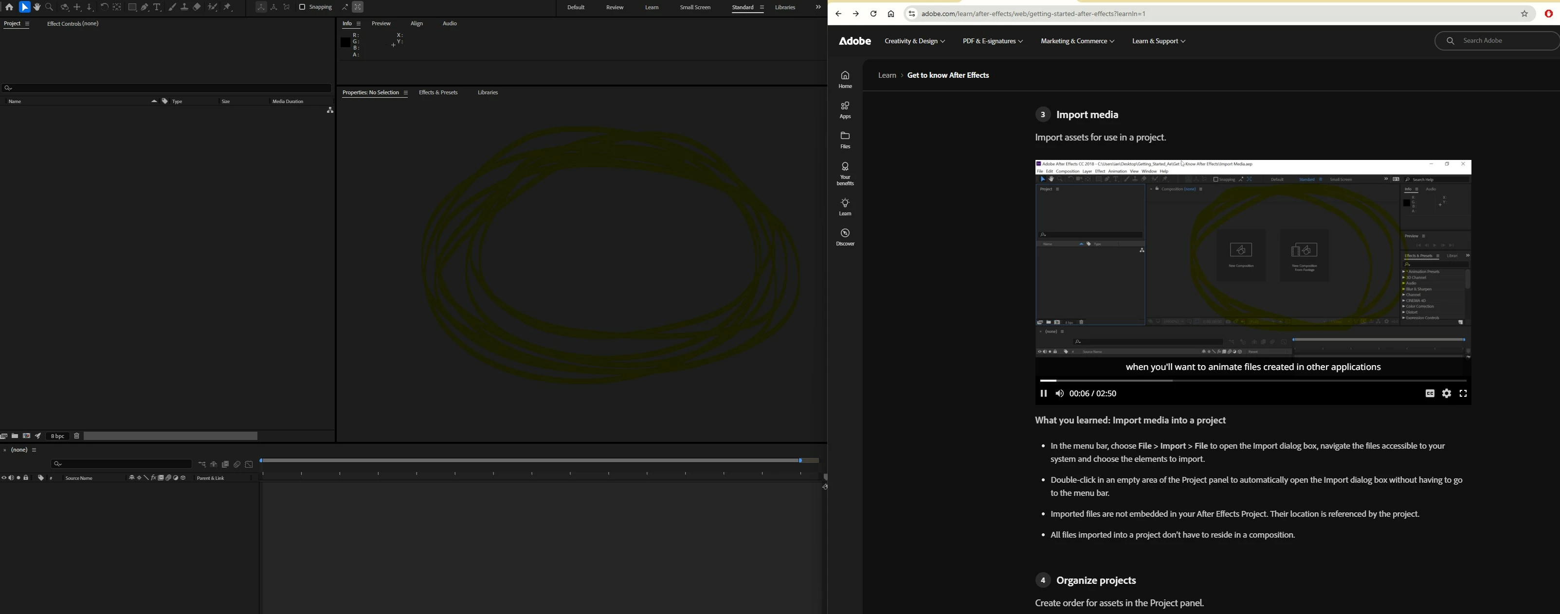 Step 3 in the first tutorial in learning After Effects and already stuck. On the Import media video at https://www.adobe.com/learn/after-effects/web/getting-started-after-effects?learnIn=1, the presenter has icons for New Composition and New Composition From Footage. I don't. The panel is just blank. The Composition menu has 'New Composition'.... but no 'New Composition From Footage.' File>New doesn't have it. So how do we create a new composition from footage?