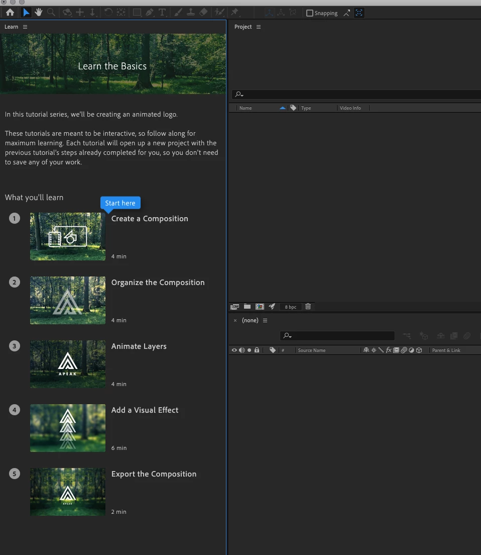I'd like to learn After Effects and would like to follow the "Learn the Basics" tutorial offered in the application before going further on YouTube, etc. However, I've run into a roadblock.