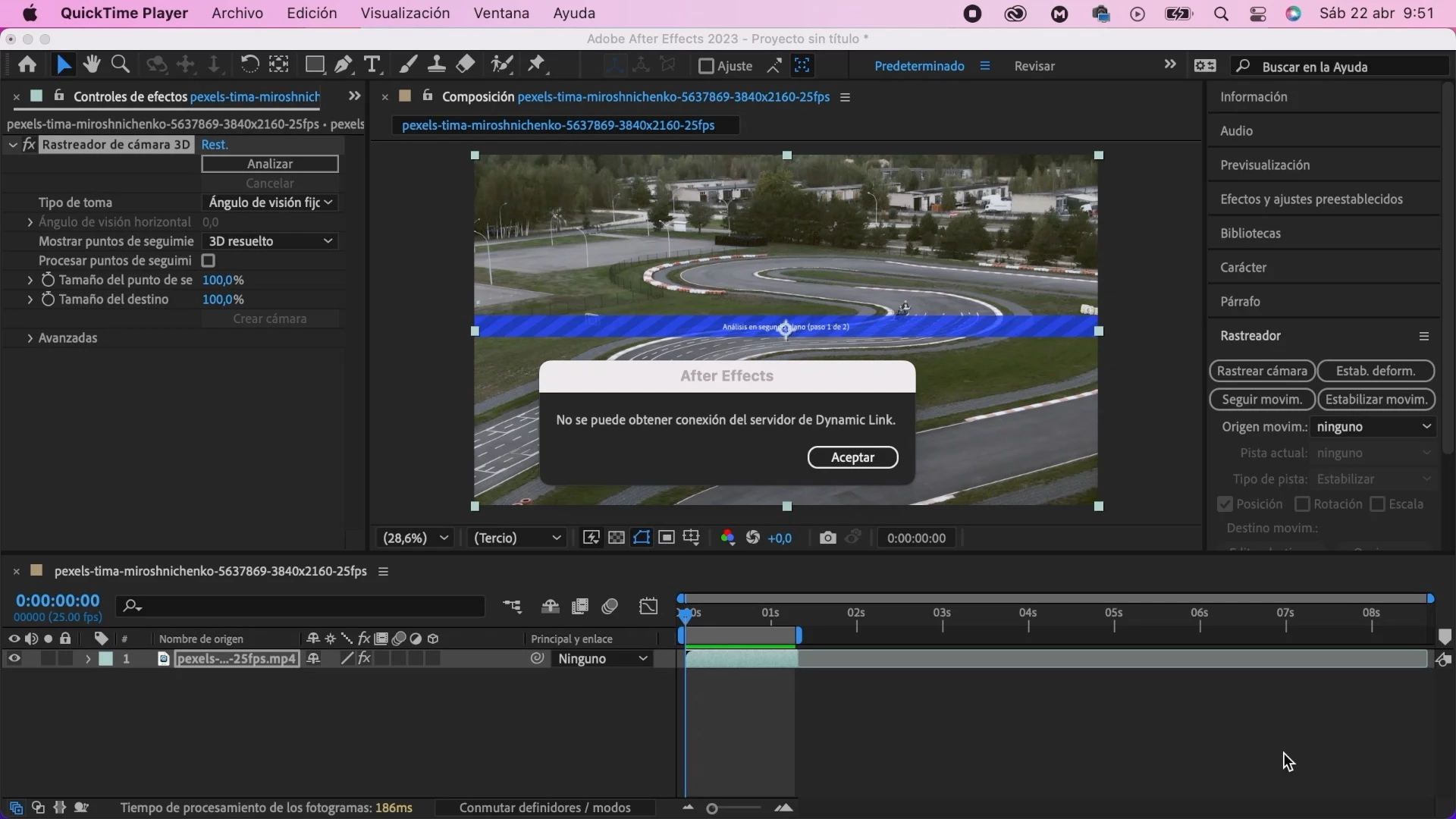 Buenos días, necesito ayuda, me sale un error que me está volviendo loco. Cuando quiero usar "Rastrear cámara" y "Estabilizador de deformación" me sale el siguiente error: "No se puede obtener conexión del servidor de dynamic link".