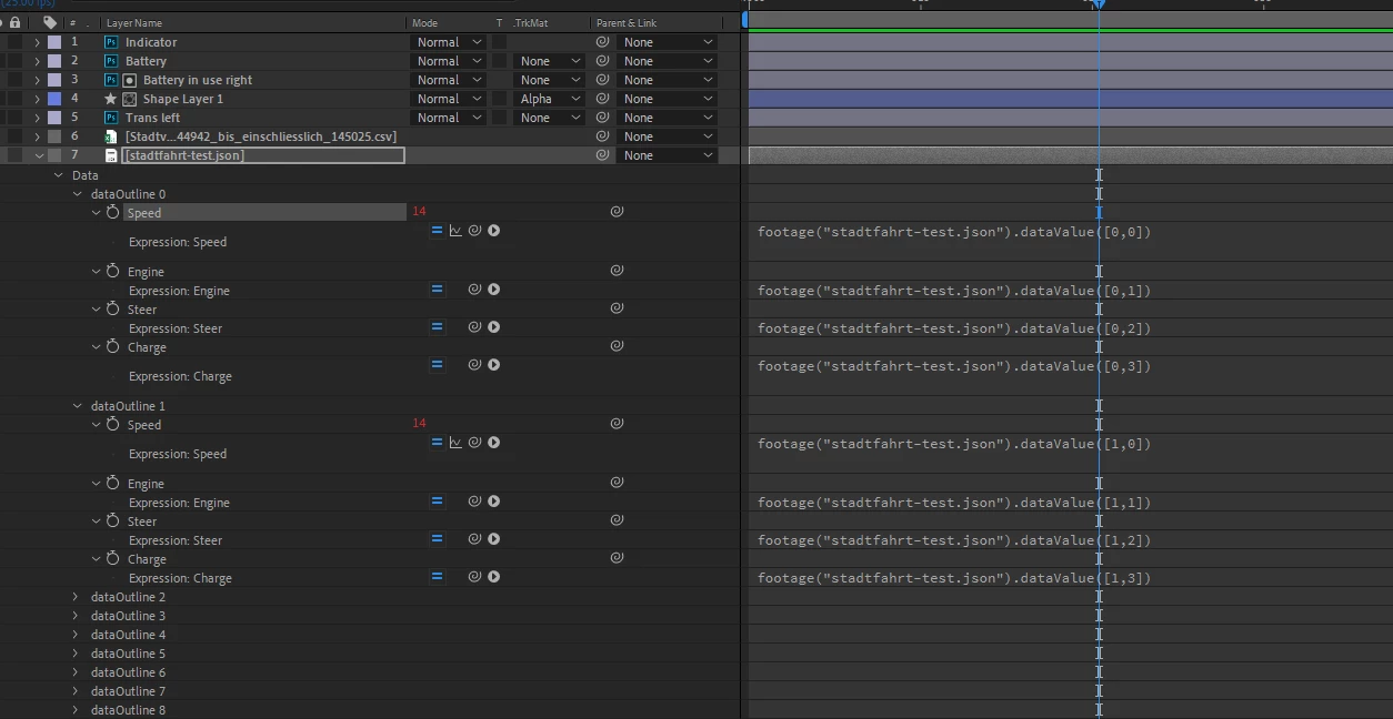 You see After Effects interprets the JSON file in a two dimensional way: dataValue([x,y]) whereas x represents the number of entry and y stands for the entry's parameter (0 = speed, 1 = engine, 2 = steer, 3 = charge)