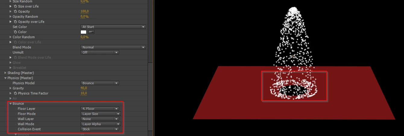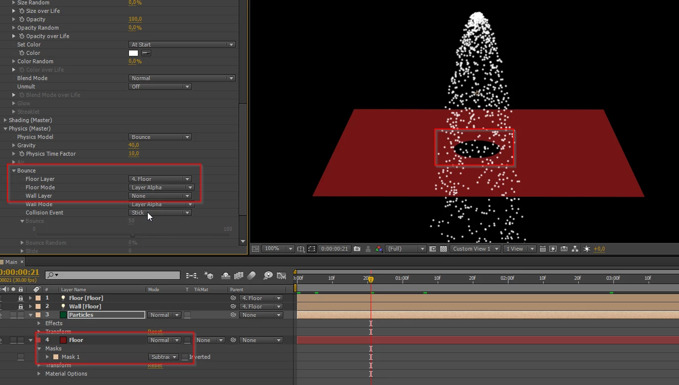 I try to make a simple thing : Generate many particles, bouncing on layer (a floor)... but passing through a hole (designed by a mash, but maybe it's not a good choice).