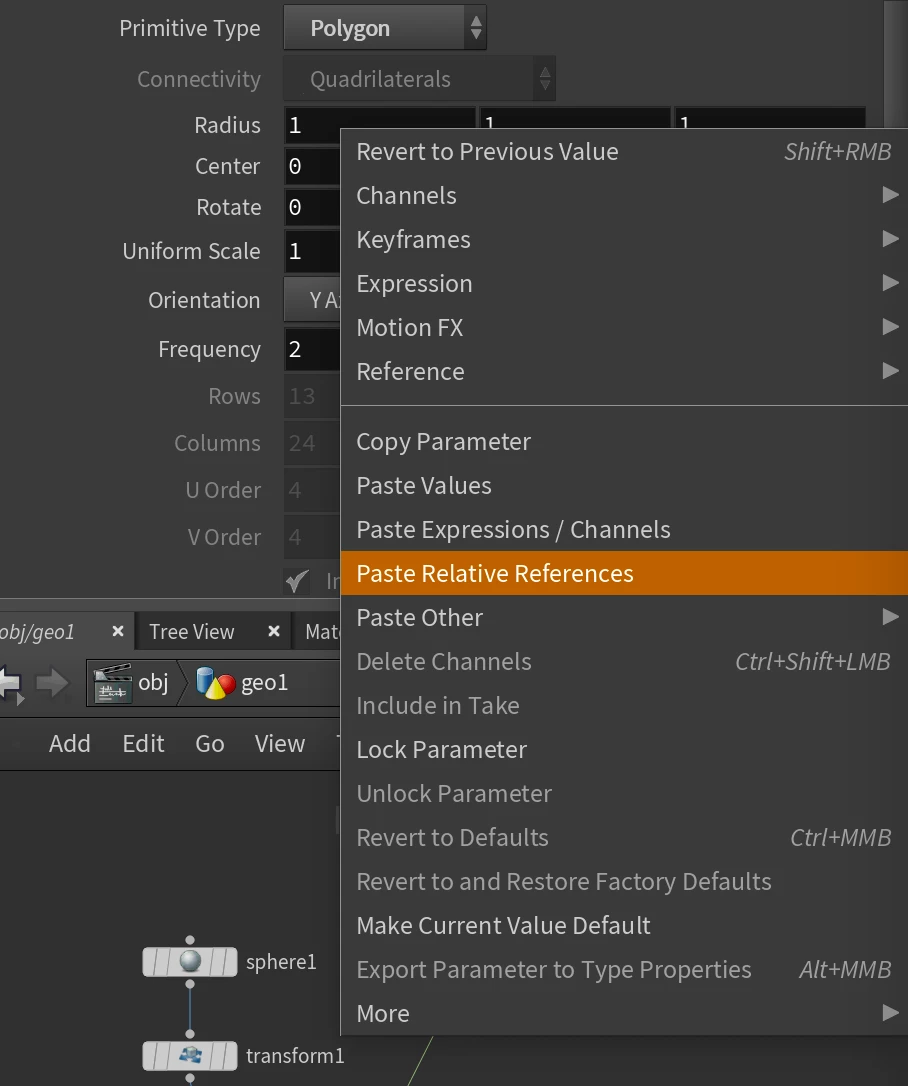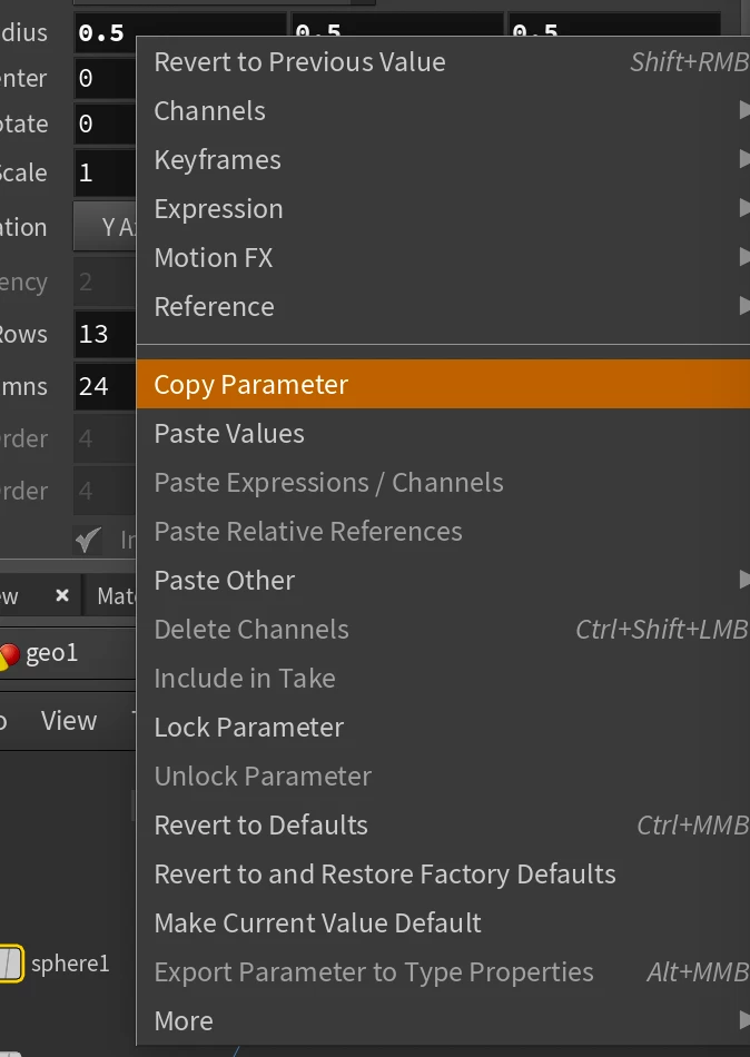 In Houdini you can copy a parameter and paste it into any other parameter with the same data type (object, array, float, vector etc.) just like you can with After Effects properties. When you paste in Houdini though you also have the option to paste a relative reference so that the value updates automatically. In the screenshot, I have 2 spheres and link the x radius of the first sphere to the x radius of the second.