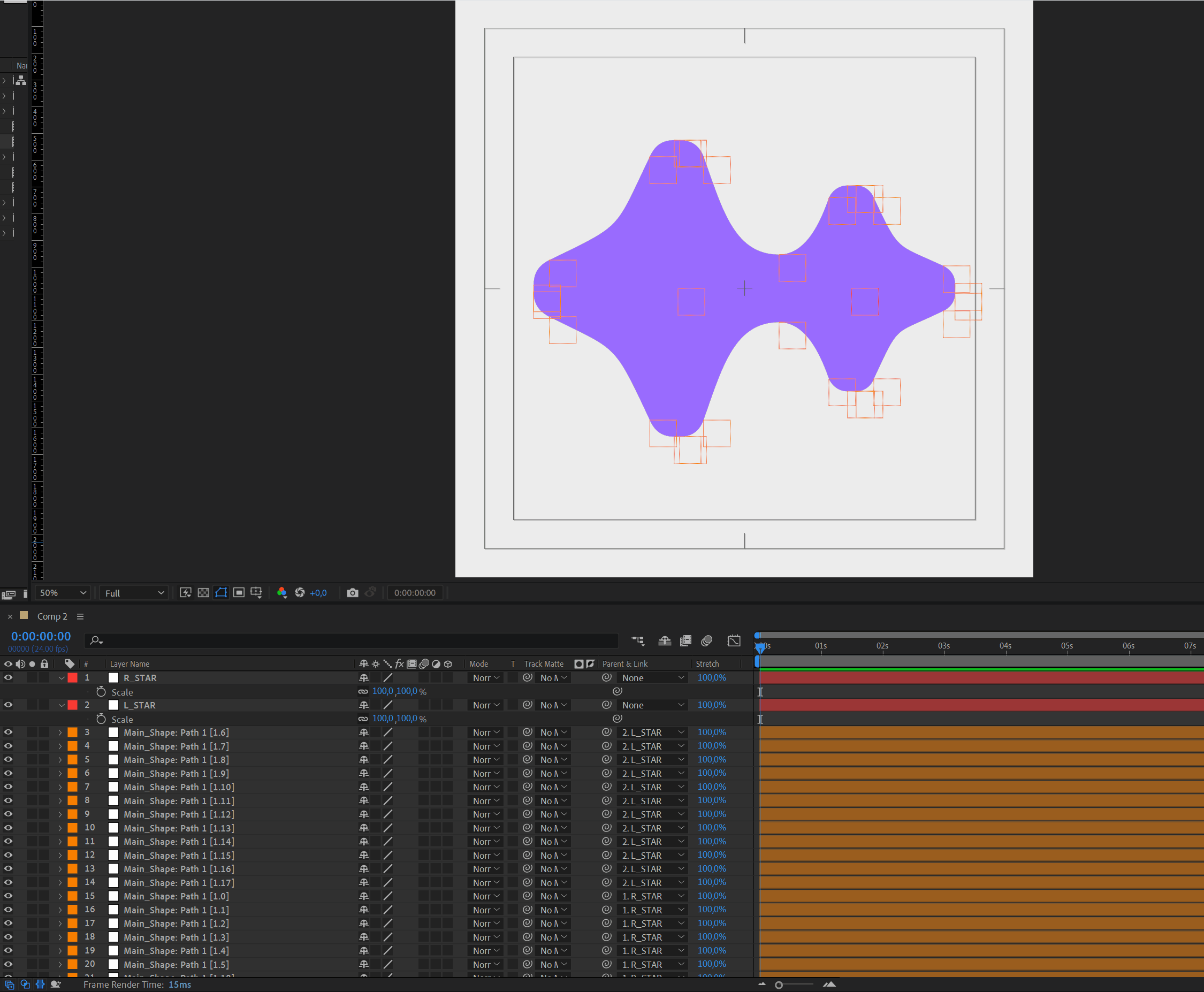 I want the left and right stars to scale separately. So I created new null objects in the center of the right and left stars, respectively (it is important to mention that the shape is a single path, and it is important for me to make it so that the left and right parts move independently of each other). The problem is that when I scale the left star, its shape is correct. But when I scale the right star, the shape is very deformed.