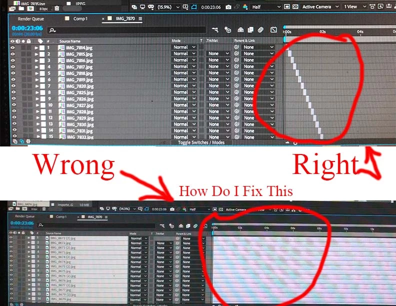 They yanked my licence without warning and was forced onto the new version of the program which doesn't have my settings & things are almost the same but not quite.... So what happens is when I drop & drag as I normally would for a new composition, for some reason all the photos stack on top of each other as all the same length instead of the automatic function it did before to make sure they are not stacked like that but are each photograph/frame about a second or so each but are spread out like frames of a film - not stacked on top of each other. I shouldn't have to do this manually. I know I ran into the same problem the very first time I used the program in 2012 but I don't remember how to fix it and don't remember what my ex did to make everything work automatically.