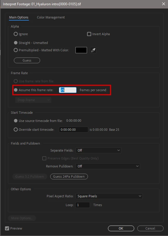 After that I will control the playback speed of the sequence using right-click on the imported file > interpret footage > main, and setting the frame rate: