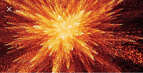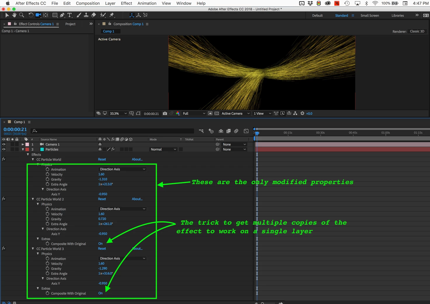 That effect was done with Particular and multiple emitters. I showed you a simple way to get producers (emitters) pointing in different directions. You could animate the Z position of each emitter and turn gravity to Zero. If you were using Particular you could get the particles to explode around the emitter by increasing the birth rate, decreasing the number of particles and animating the physics. You cannot reproduce that exact effect with the particle generators included in AE but you can get a similar pattern with multiple copies of the CC Particle world effect as I demonstrated.