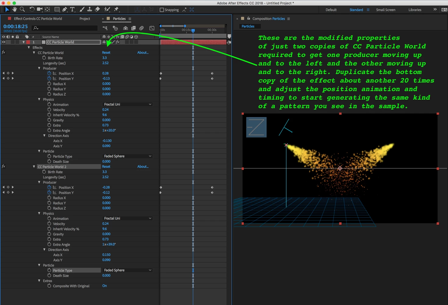 You should be able to duplicate this by adjusting the properties that I modified. Then work on the look of the particles, add animation to the producer (emitter) to make it bigger and animate the physics, lifespan and whatever other properties you need to animate to get the bursting and dying particles at the end of the motion path, then duplicate it again 100 times adjusting paths of each of the producers and the timing to get the look you want, then if your system does not die you will have come close to the same look using a standard effect.