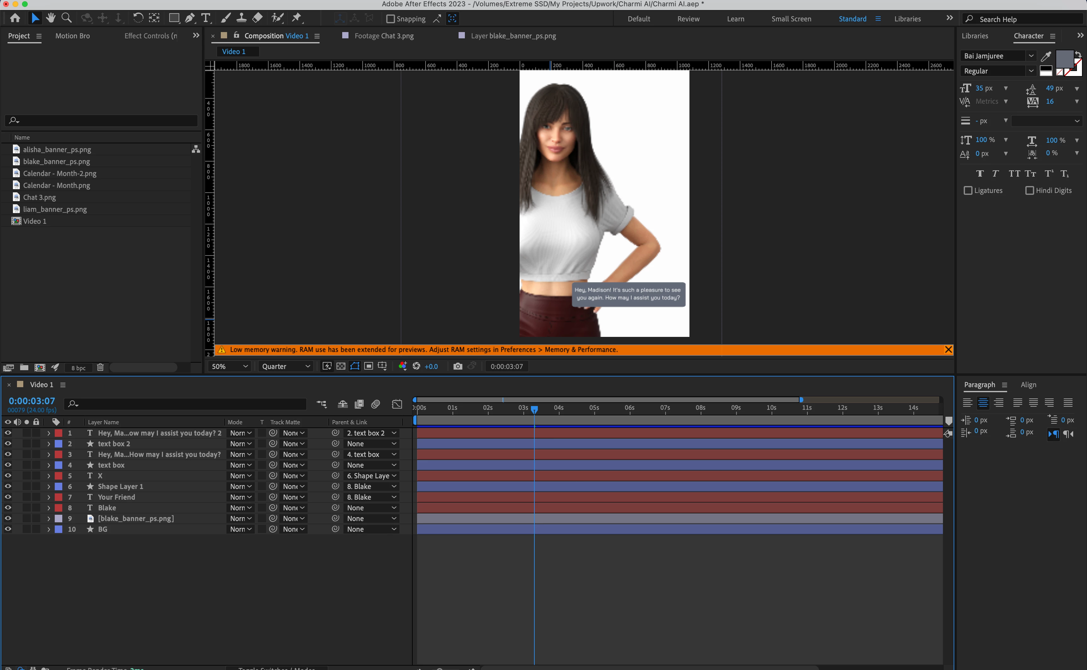 Here is my current After effects comp containing only a few texts, a single picture and a few shapes. All not more than 10 layers.