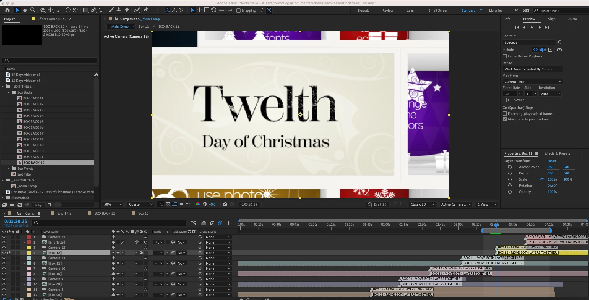 I've got this collection of Pre Comps that end up being a christmas tree filled with clips. Something I grabbed from the adobe shop. I've got everything timed the way I want it to go with the music I've picked. I'm just running into a big problem.