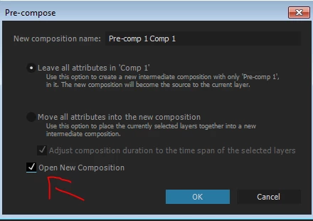 Now when I pre-compose, it opens another window but brings me there immediately which is very annoying. I've tried unticking the "Open new composition" to see if that would change anything. It left me in the same window, but that just means I have to bring it down the composition manually from the project tab which is also very annoying.