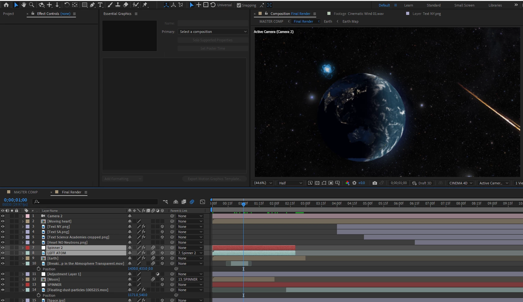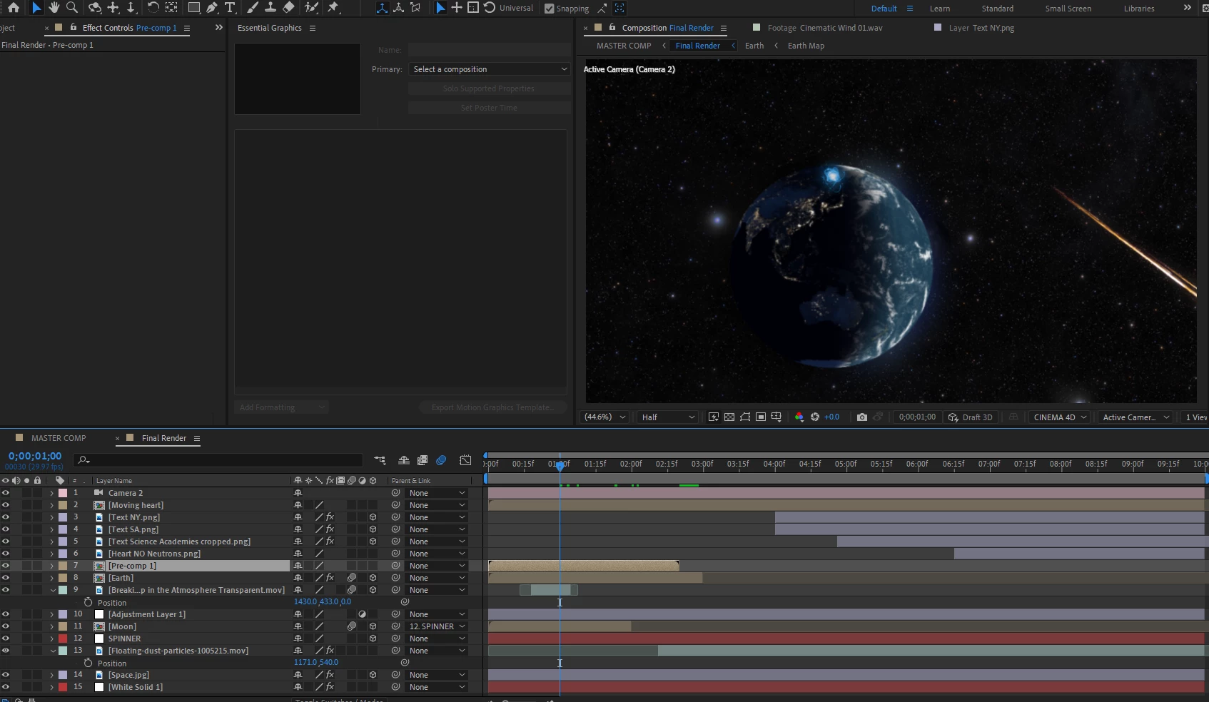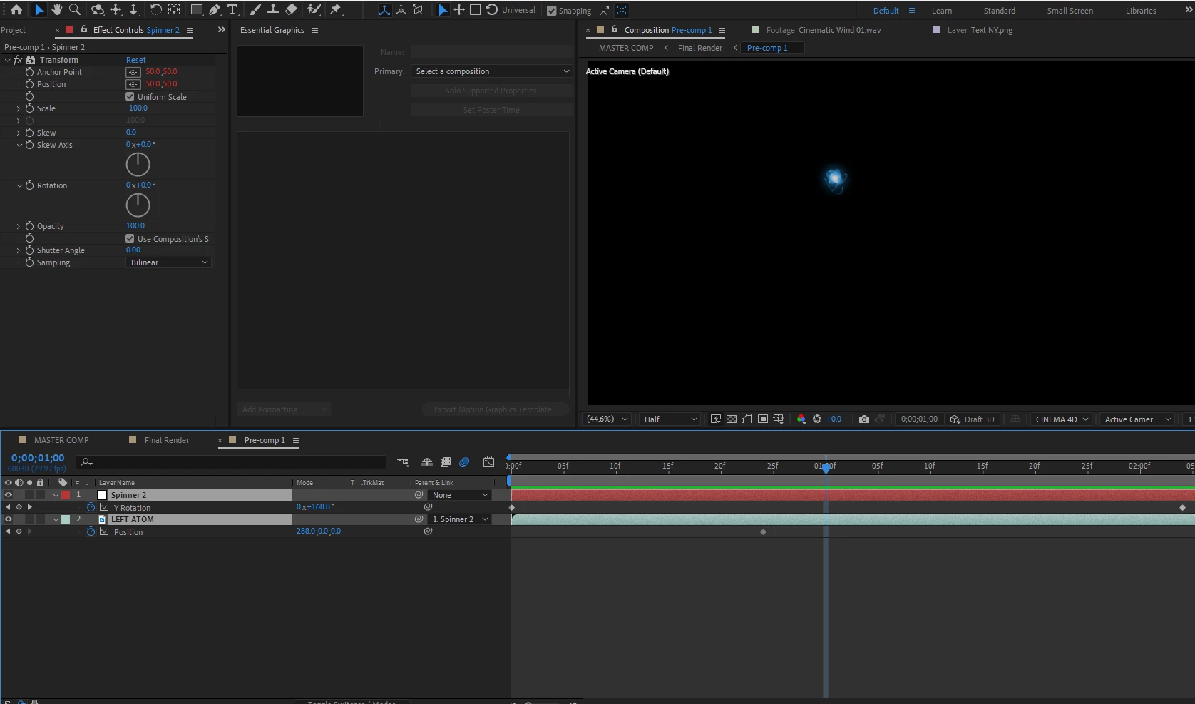 I have an atom orbiting an earth which is parented to a null object. I'm trying to precompose this animation so that I can duplicate it and flip it to the opposite side creating two orbiting atoms. But when I precompose the layer and the null, it changes position on the screen. All these layers are 3d including the new precomp. I've tried so many different ways that I feel I'm missing something more important.