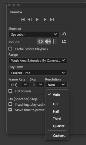 When I preview I have it set as 'quarter', (this is also the same in the preview panel), but when i start previewing it goes to full, and makes it difficult to watch as it takes a considerable amount of time to render in real-time at 'full' quality. I'm not sure why it's doing this.