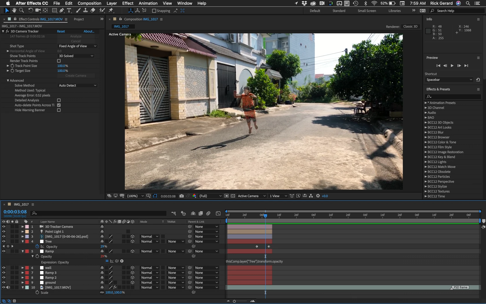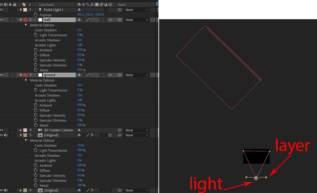 When all of the masks are good, add an expression to opacity for all of the 3D layers that points to the opacity of the top layer, animate the opacity to reveal the actor and then as the last step trim all of the 3D layers from the camera and light to the layers so you don't have to wait for rendering on any of the complex 3D layers when you don't need them anymore: