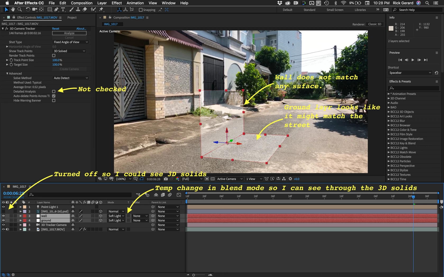 The biggest problem you are having is that you do not understand that the tracking solids you add to the comp must match the surfaces that you are trying to replace. Your 3D layers are not at all where they need to be.