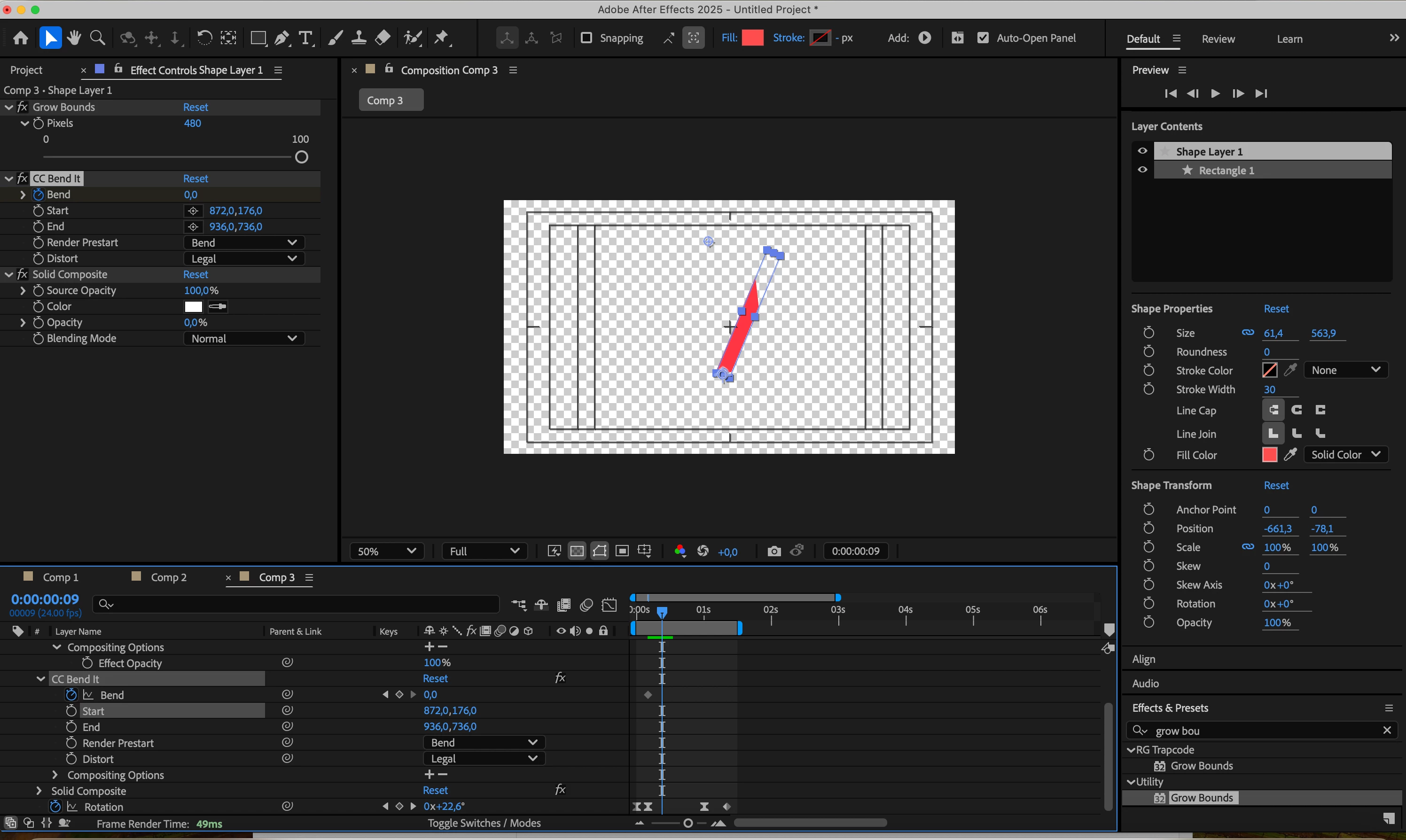 I am following a tutorial and my bend is behaving strangely. I set the start and end to receive the desired effect and I set the rotation with keyframes, when the shape turns, it breaks completely and I cannot use the bend as I would like. I noticed that the start does not follow the shape and stays in the same place. How can I fix this, and why doesn't the Grow bounds work?